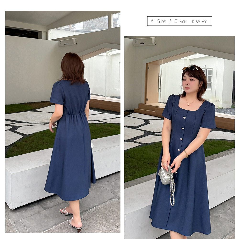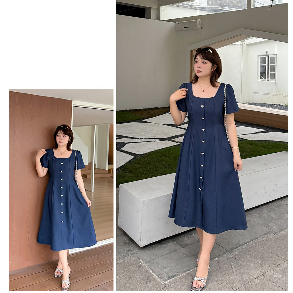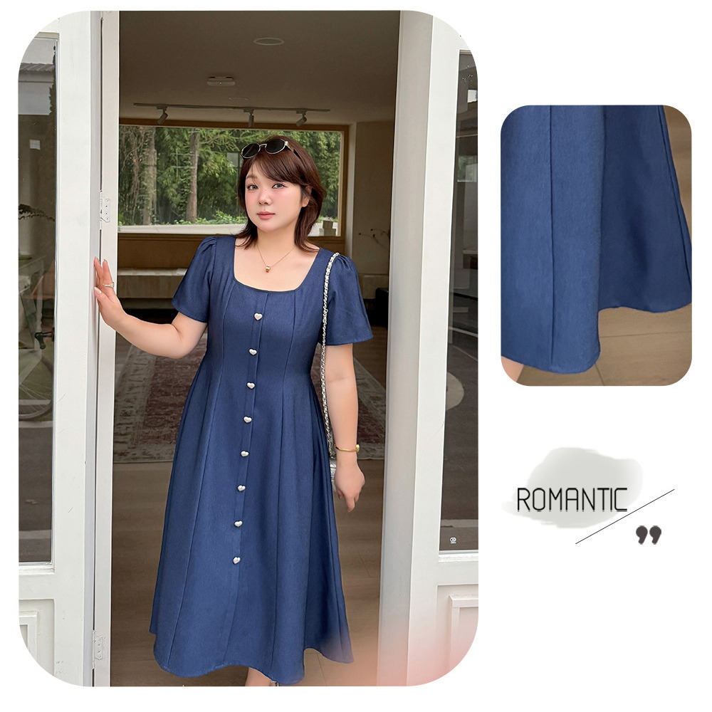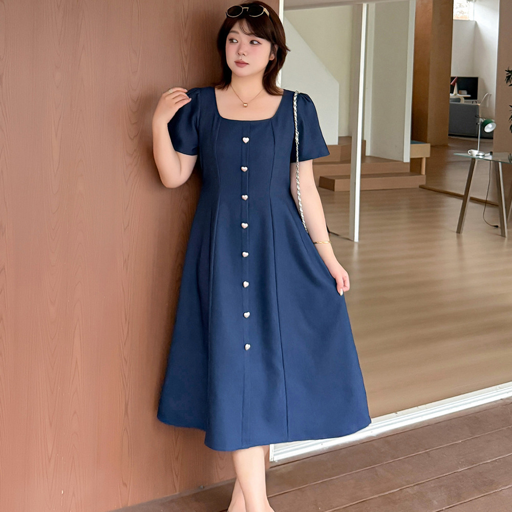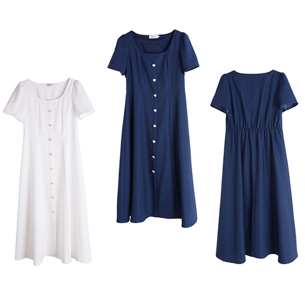 マットシルバーハートボタン飾り スクエアネックフレアワンピース