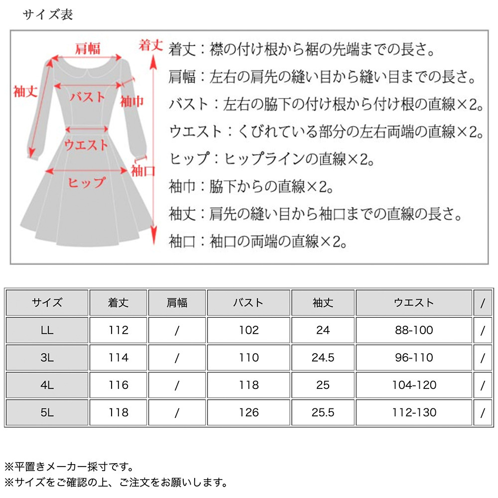 サイズ表記 LL 3L 4L 5L 着丈 112cm 114cm 116cm 118cm バスト 102cm 110cm 118cm 126cm 袖丈 24cm 24.5cm 25cm 25.5cm ウエスト 88-100cm 96-110cm 104-120cm 112-130cm