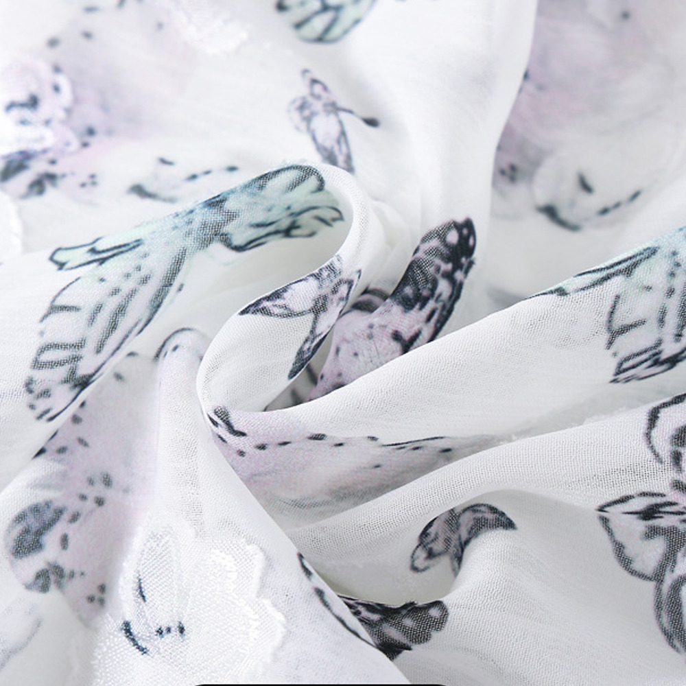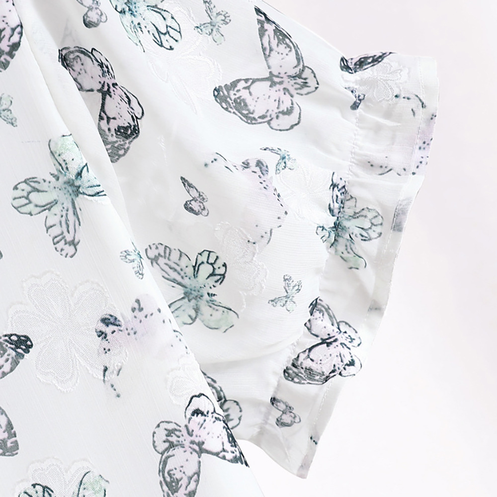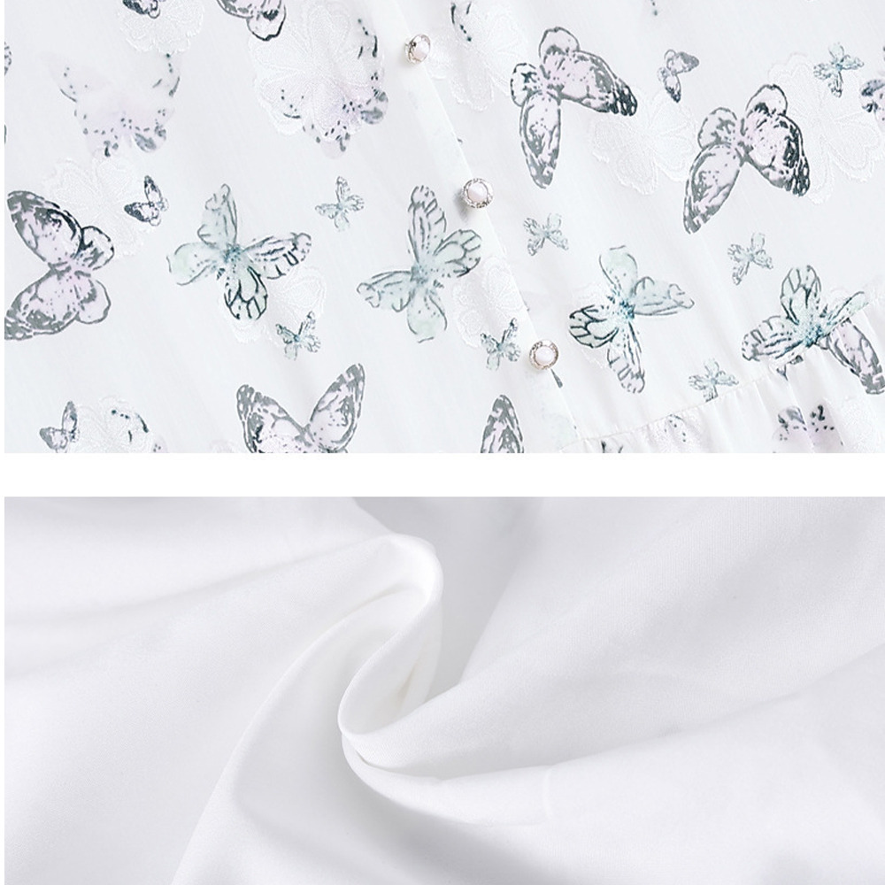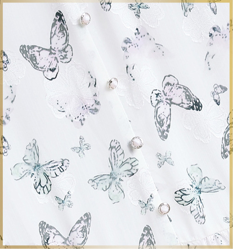 蝶の彩度の低いプリントが上品で優雅なデザイン。
