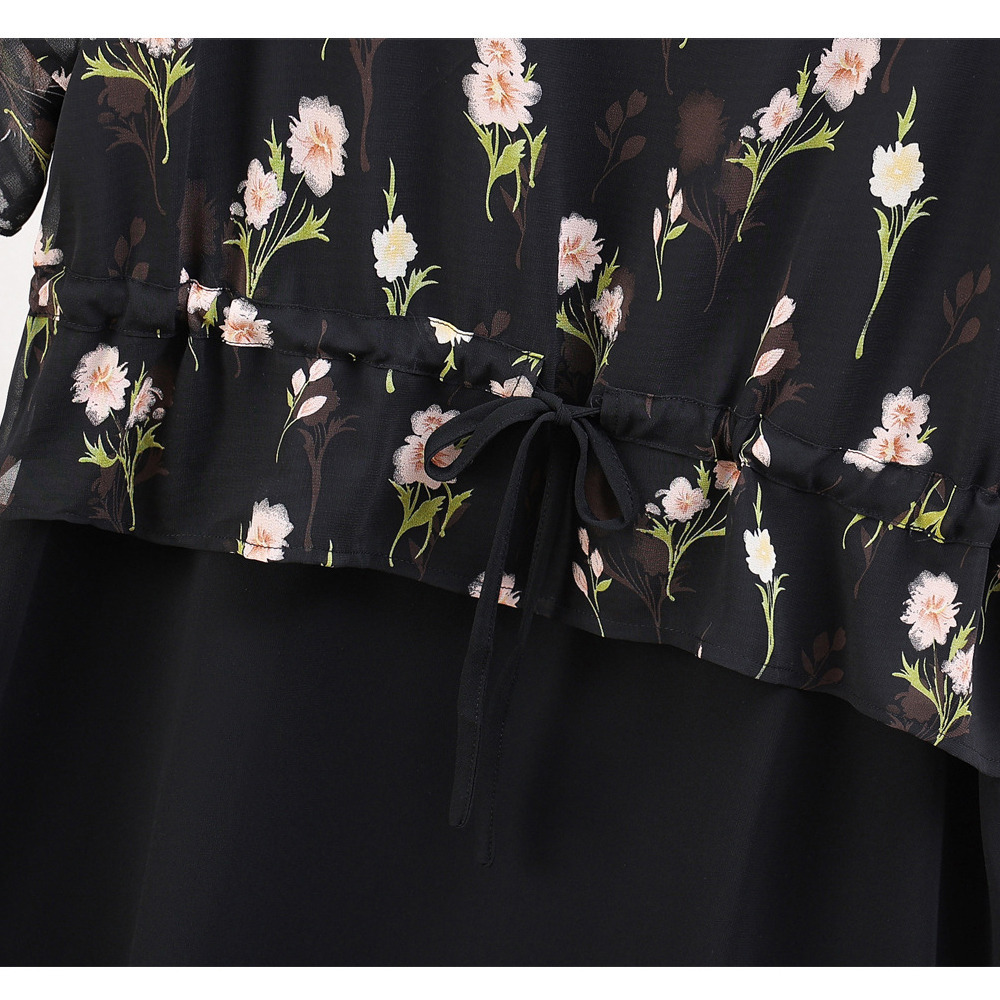 「フラワープリント×無地 シフォン Aラインワンピース」