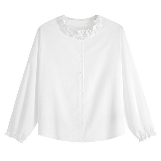 薔薇の飾り付きレース二重フリルスタンドカラー&袖口のホワイトブラウス