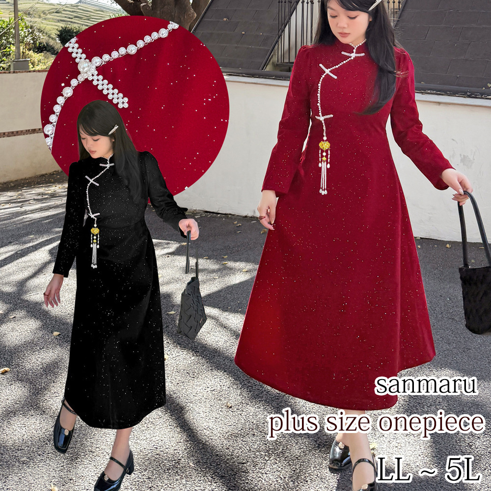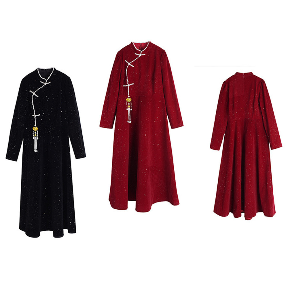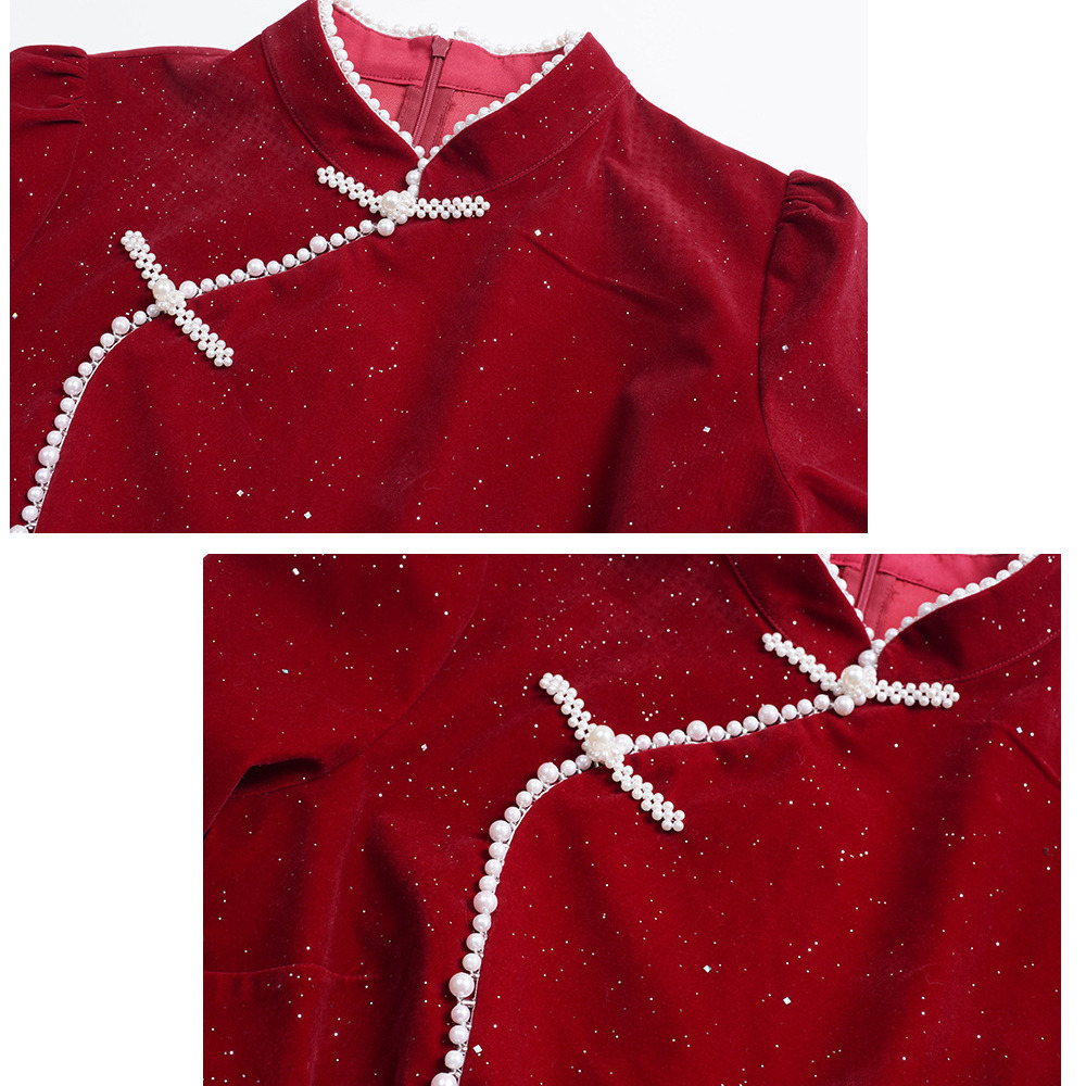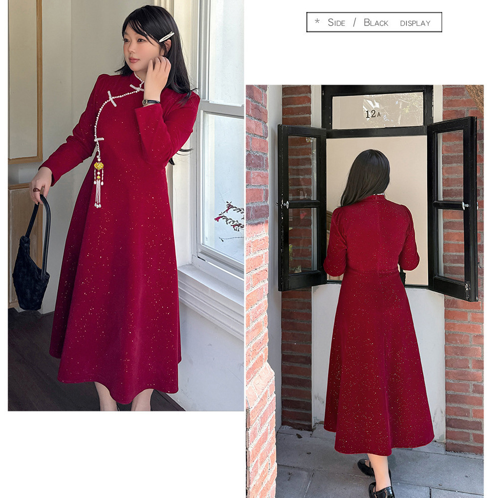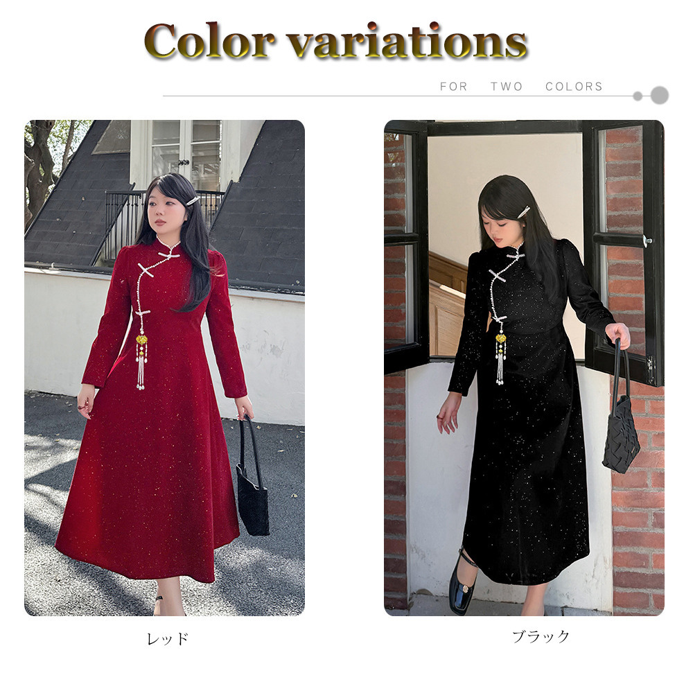 「ラメ入りベルベット生地 チャイナ風ワンピース」