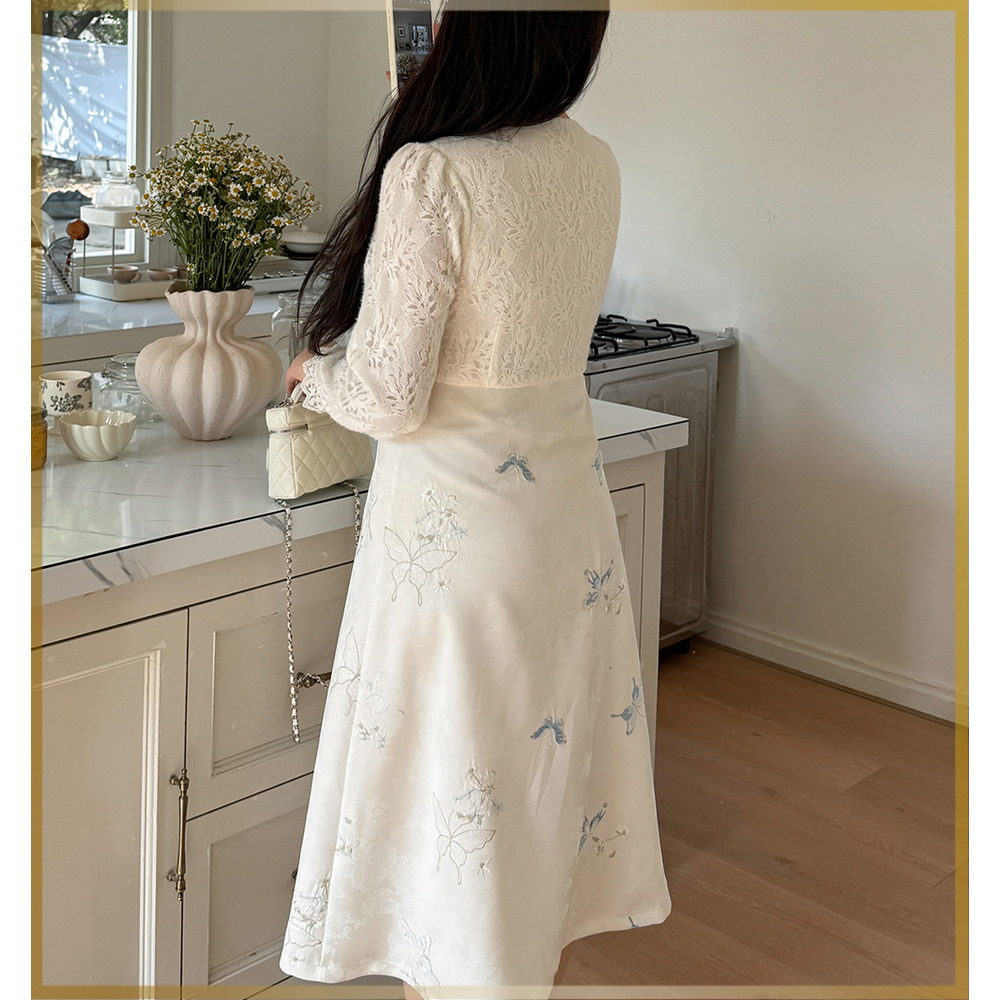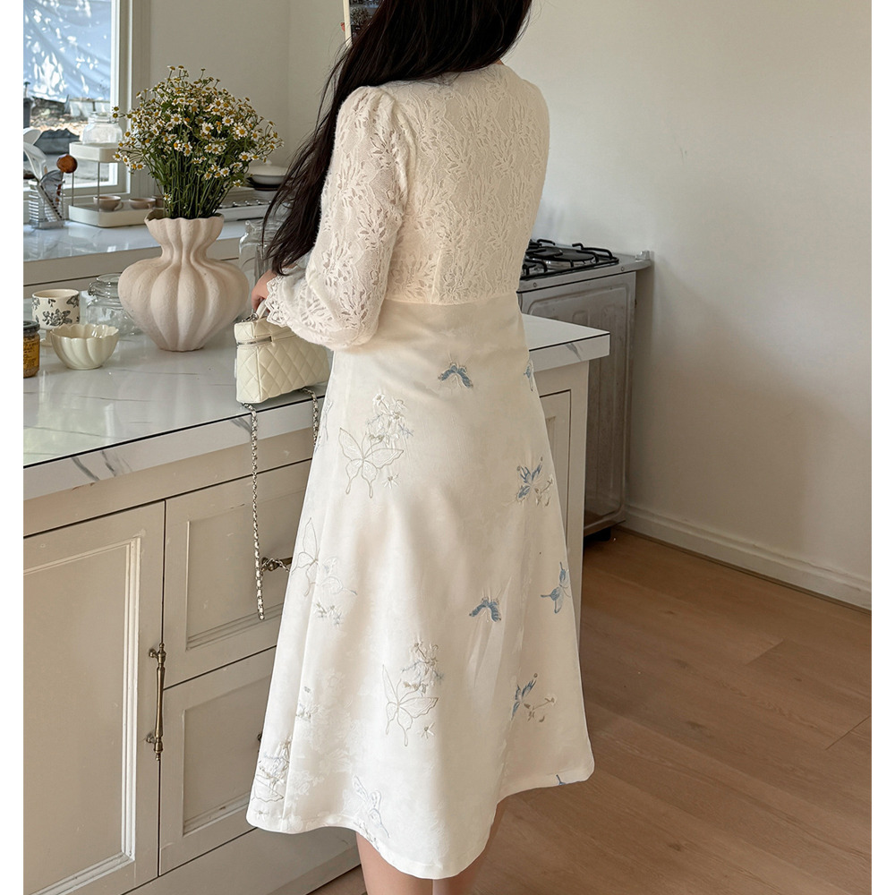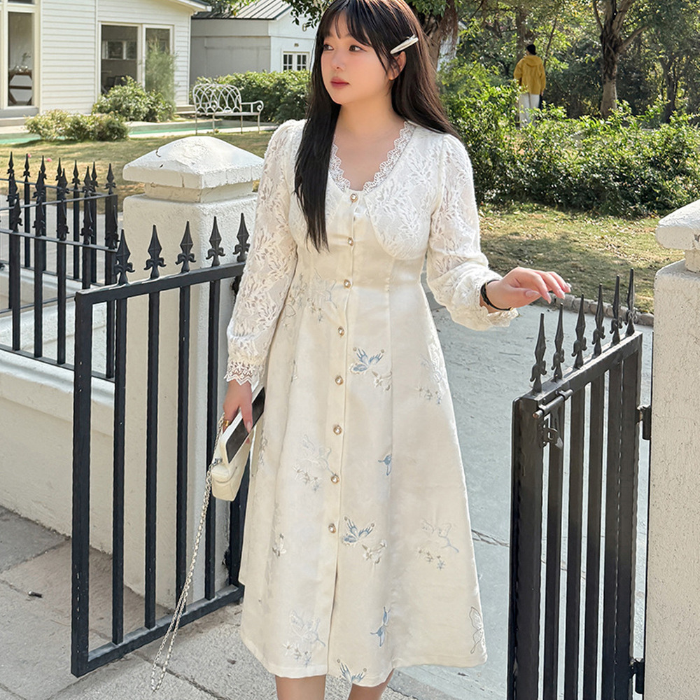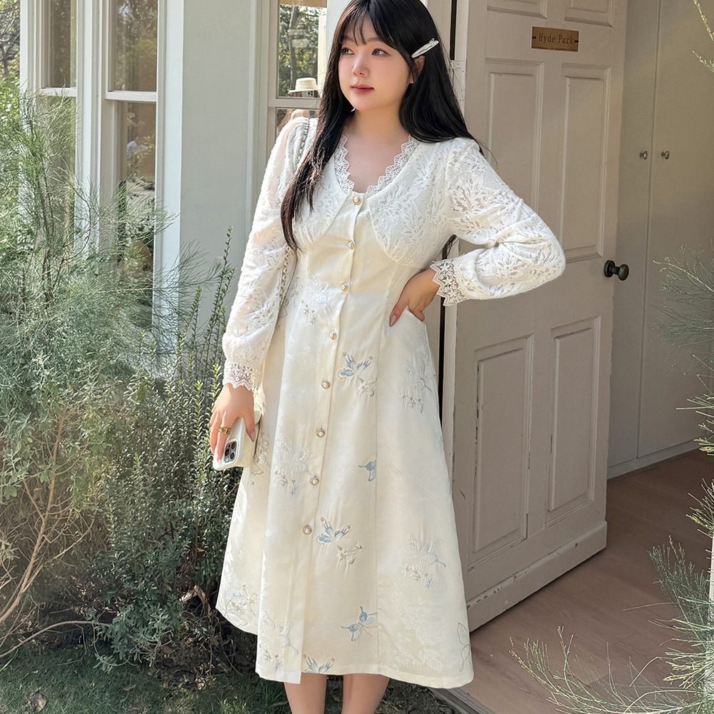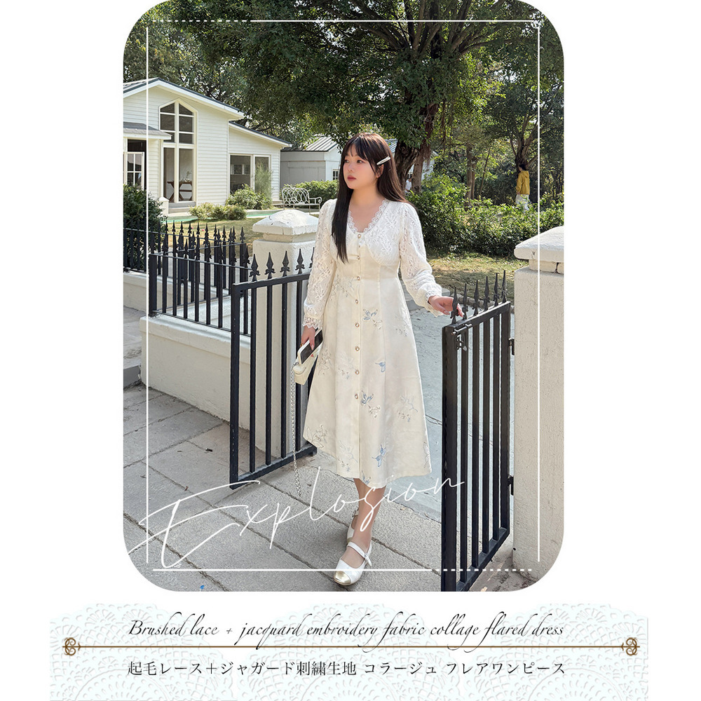 「起毛レース&刺繍入りジャガード素材フレアワンピース」
