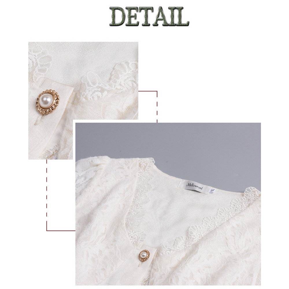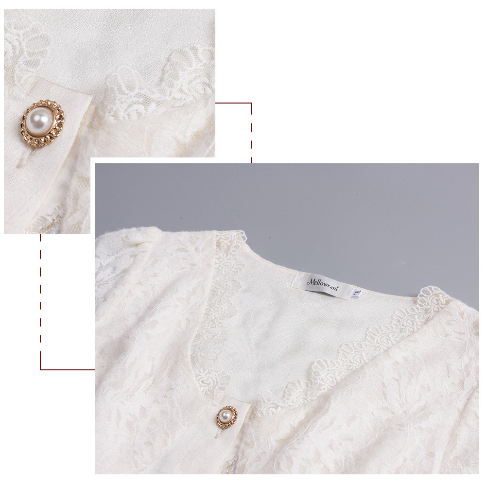 レースリボン縁取りVネックでフリルカフのパフスリーブ。