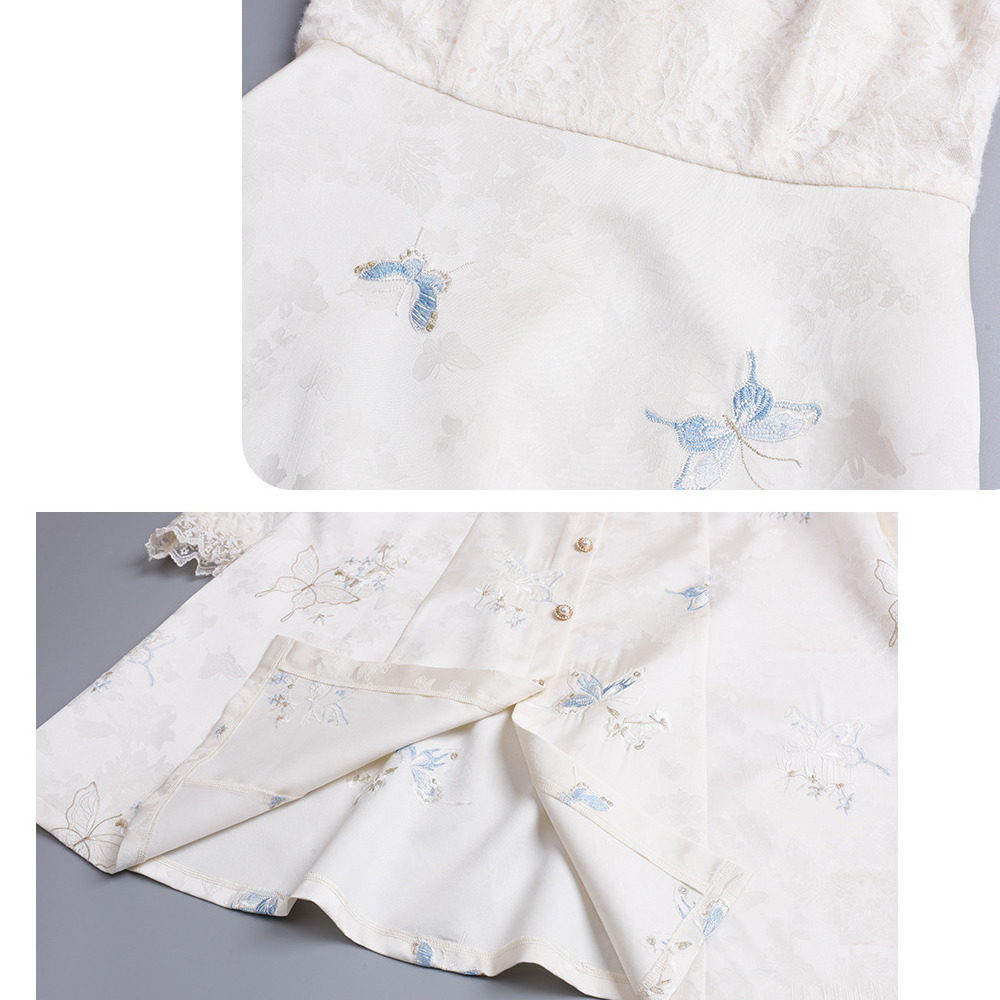 起毛フラワーレースと刺繍入りジャガード素材のフレアワンピース。