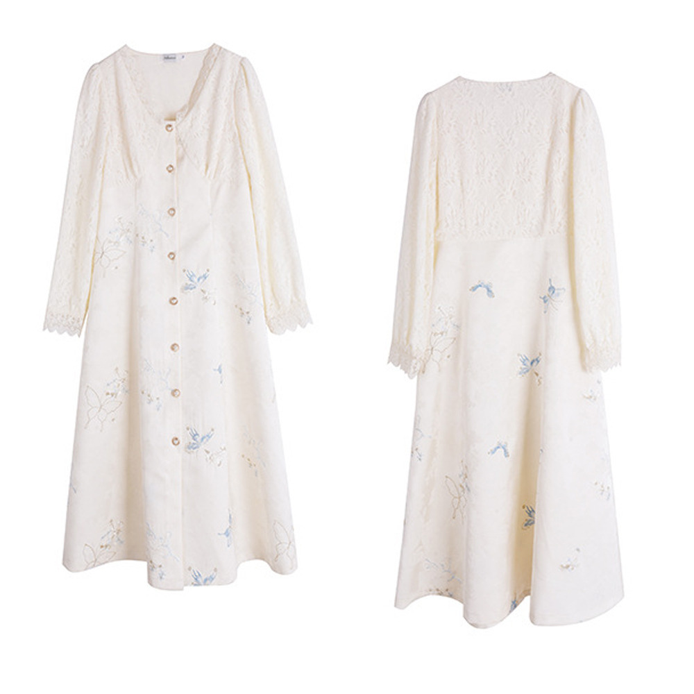 起毛レースとジャガード素材のビジューボタン開きフレアワンピース