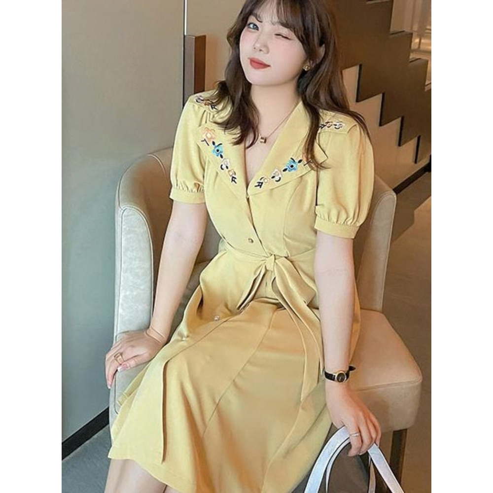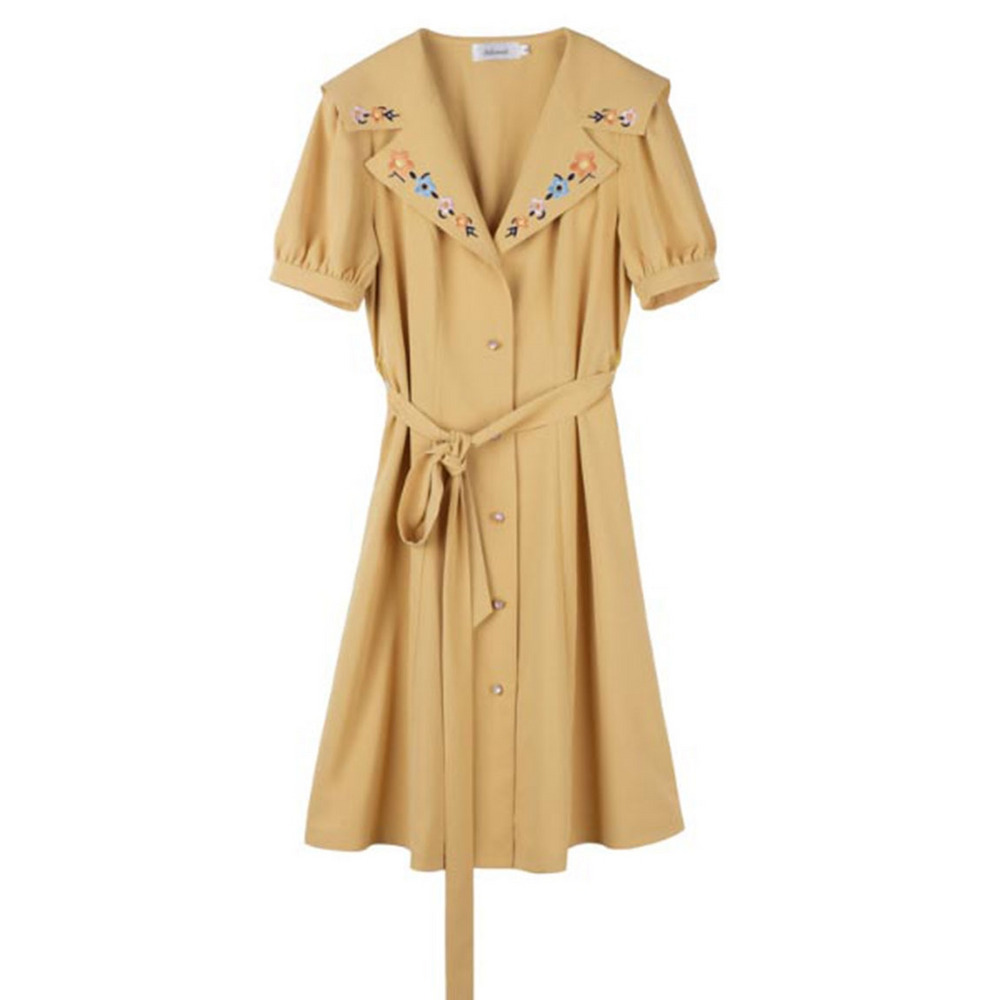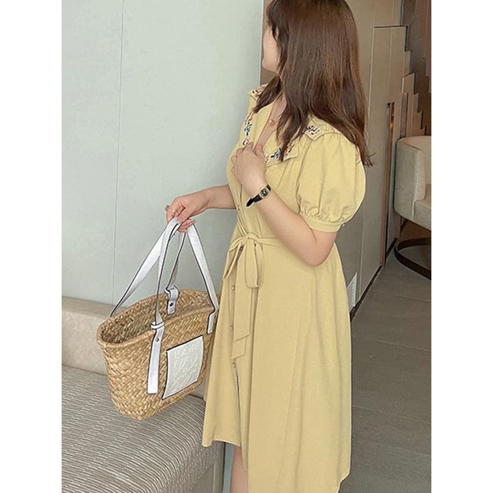 「フラワー刺繍入り襟 フロントボタン Aラインワンピース」
