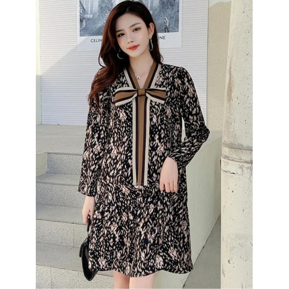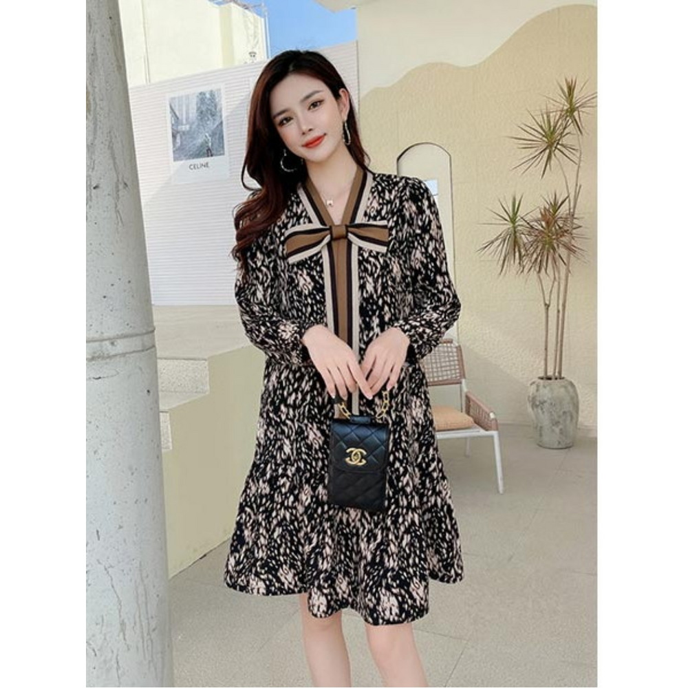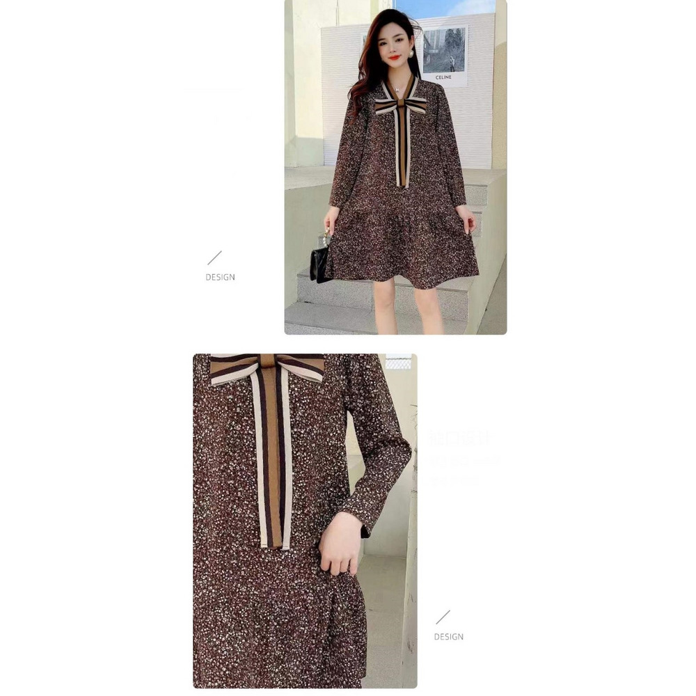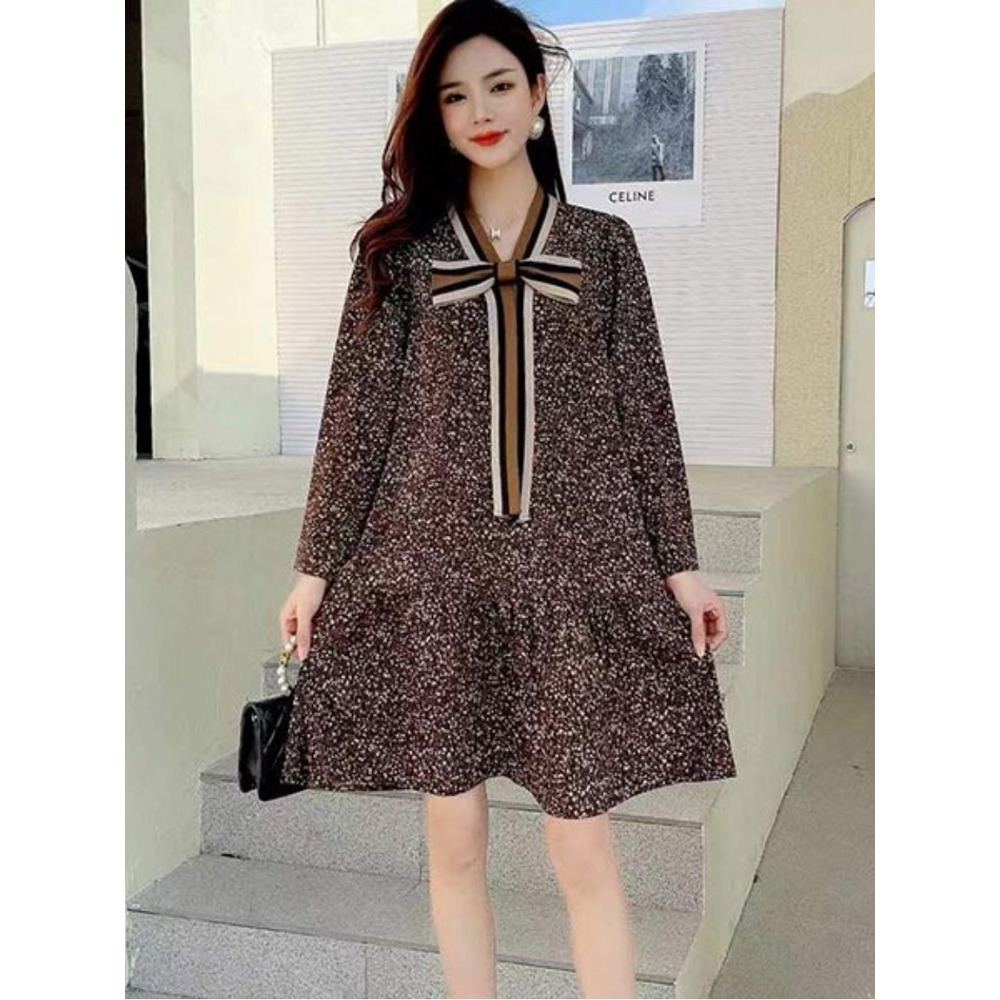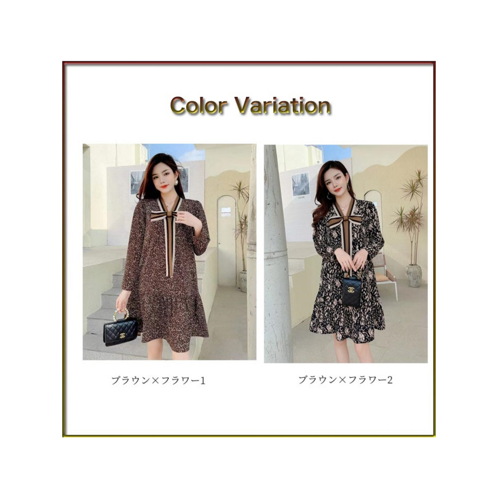 「ストライプネックリボンデザイン 花柄ワンピース」