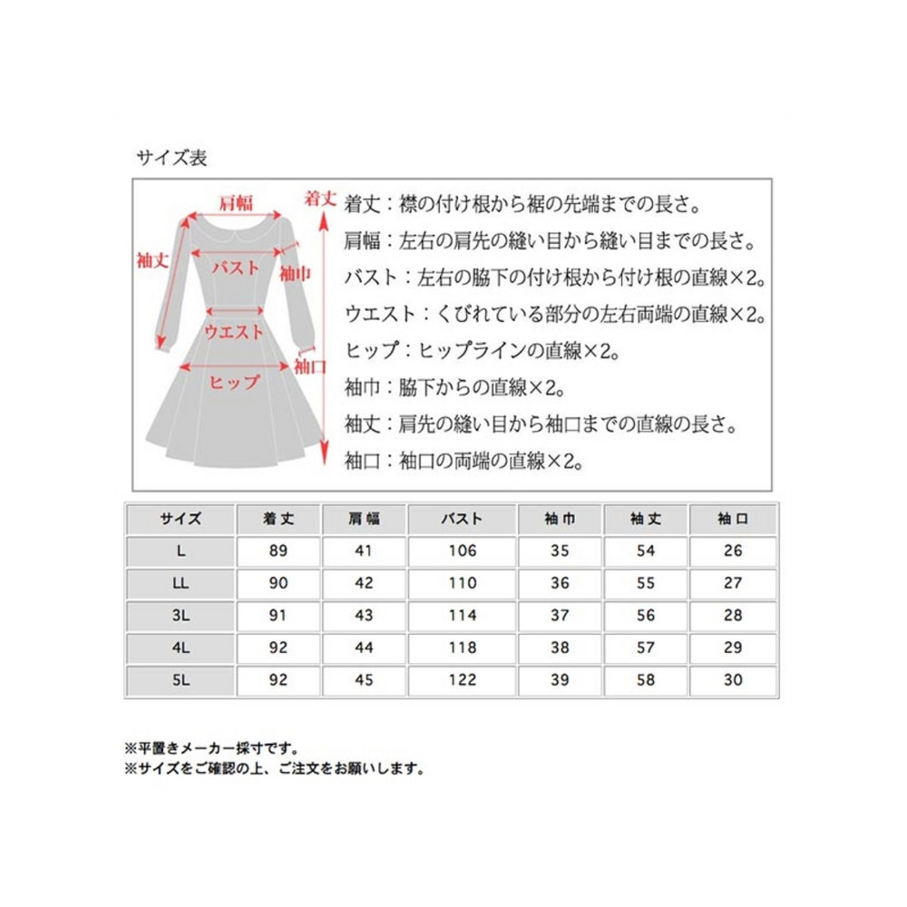 サイズ表記 L LL 3L 4L 5L 着丈 89cm 90cm 91cm 92cm 92cm 肩幅 41cm 42cm 43cm 44cm 45cm バスト 106cm 110cm 114cm 118cm 122cm 袖巾 35cm 36cm 37cm 38cm 39cm 袖丈 54cm 55cm 56cm 57cm 58cm 袖口 26cm 27cm 28cm 29cm 30cm