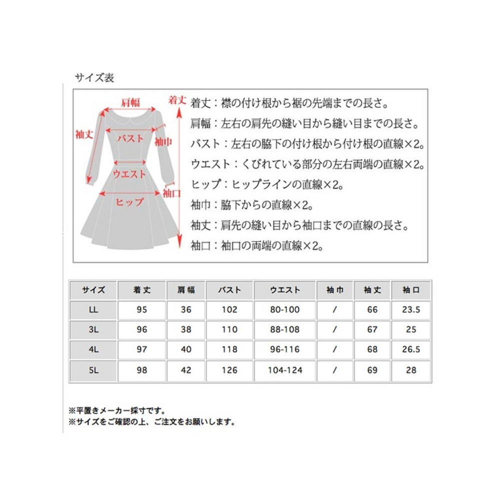 サイズ表記 LL 3L 4L 5L 着丈 95cm 96cm 97cm 98cm 肩幅 36cm 38cm 40cm 42cm バスト 102cm 110cm 118cm 126cm ウエスト 80~100cm 88~108cm 96~116cm 104~124cm 袖丈 66cm 254cm 26.5cm 28cm 袖口 23.5cm