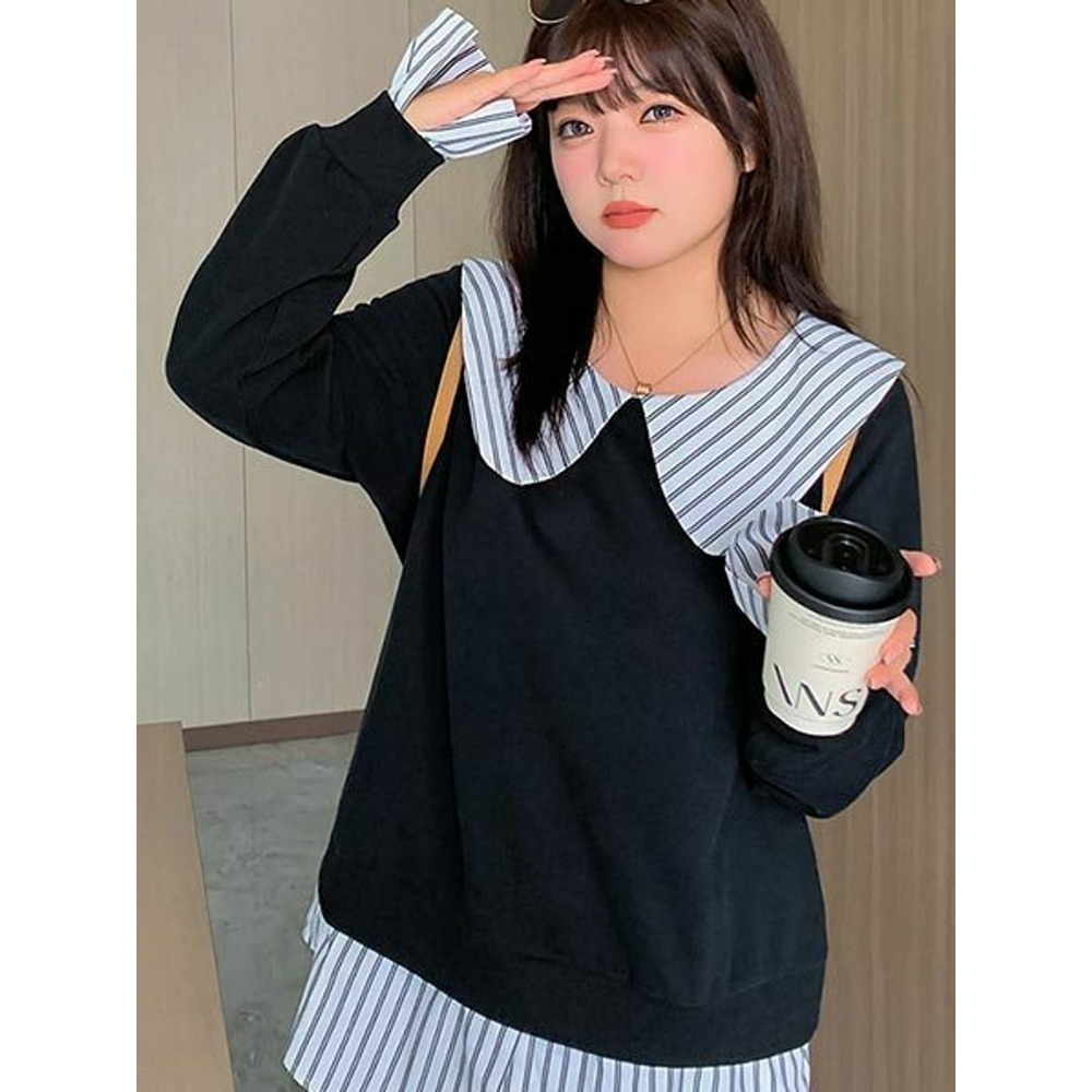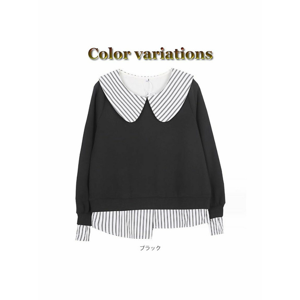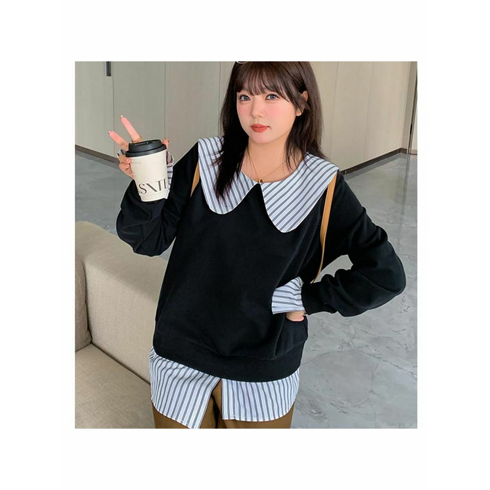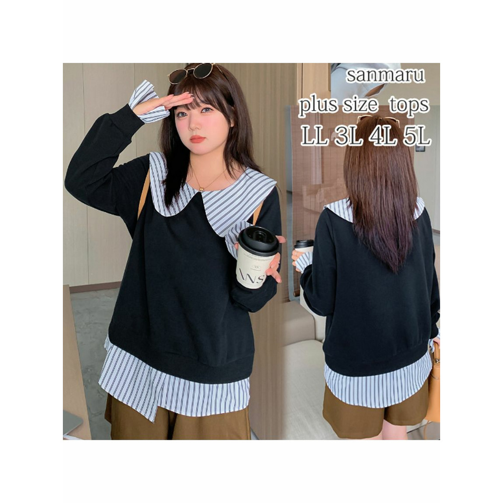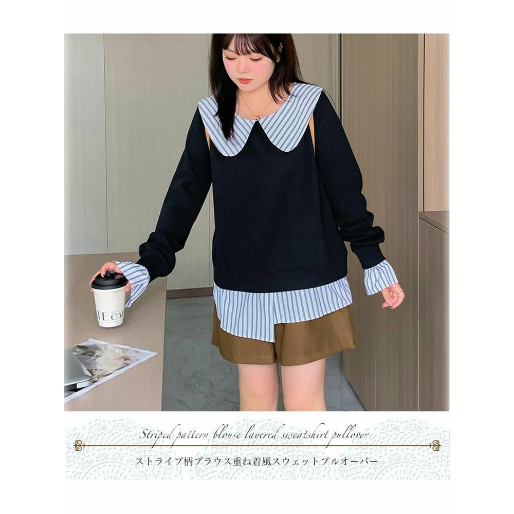 大きな丸襟のガーリーなシャツ重ね着風スウェットプルオーバー 大きいサイズレディース