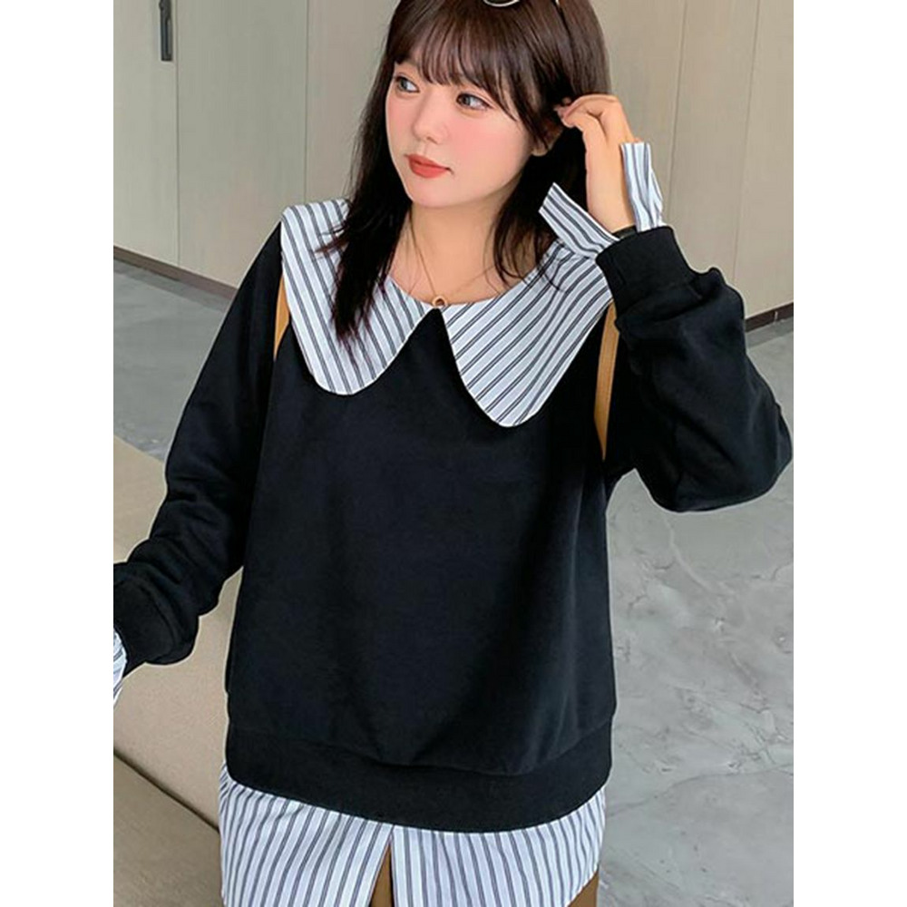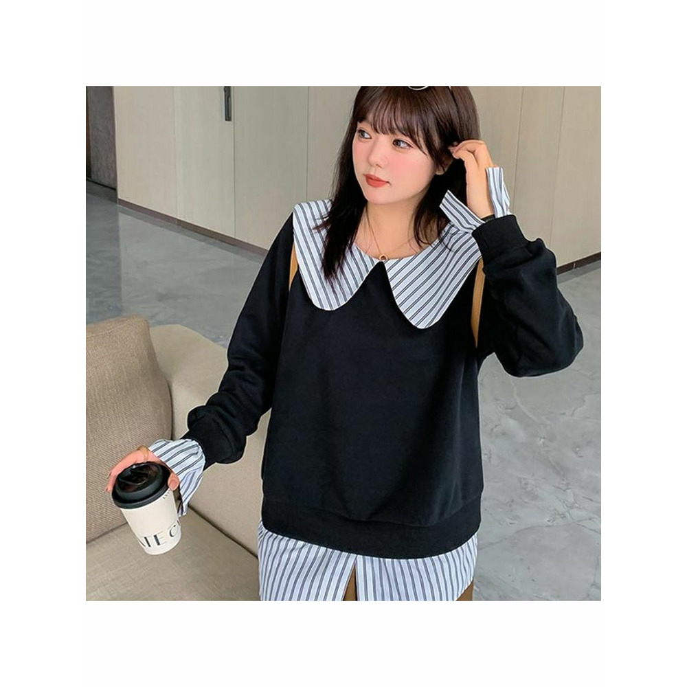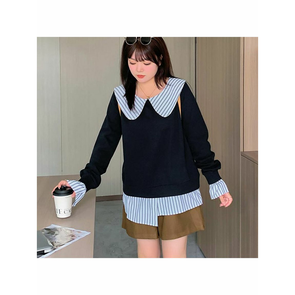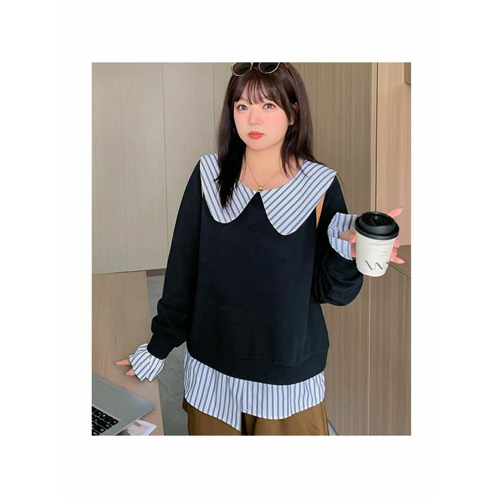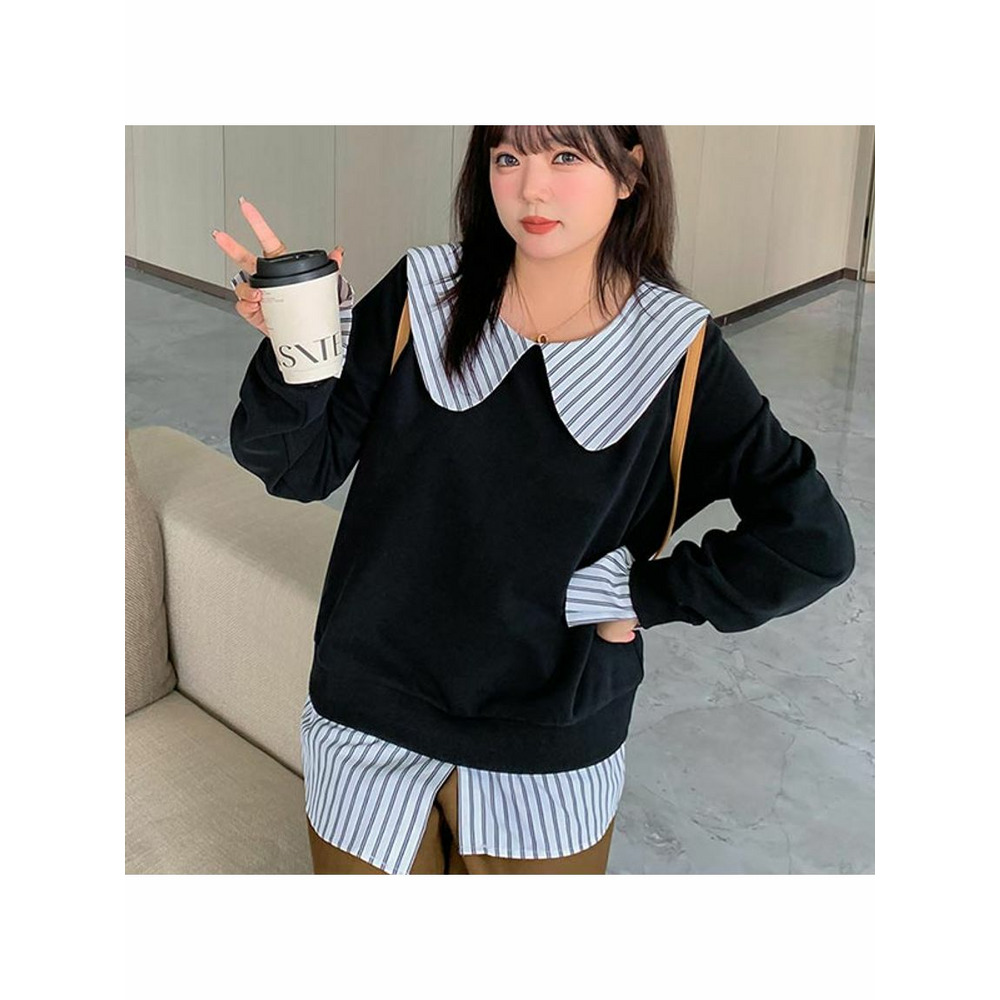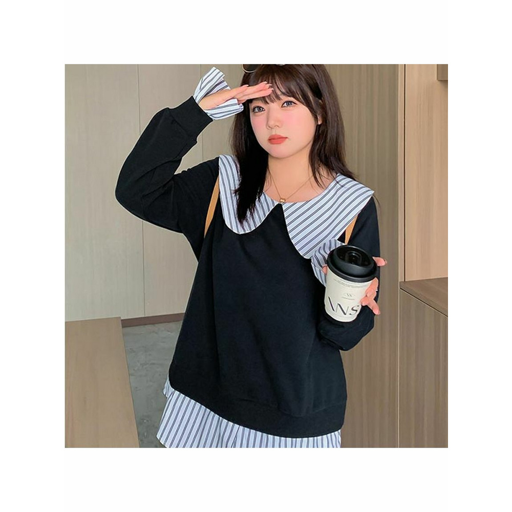 大きな丸襟のガーリーなシャツ重ね着風スウェットプルオーバー 大きいサイズレディース