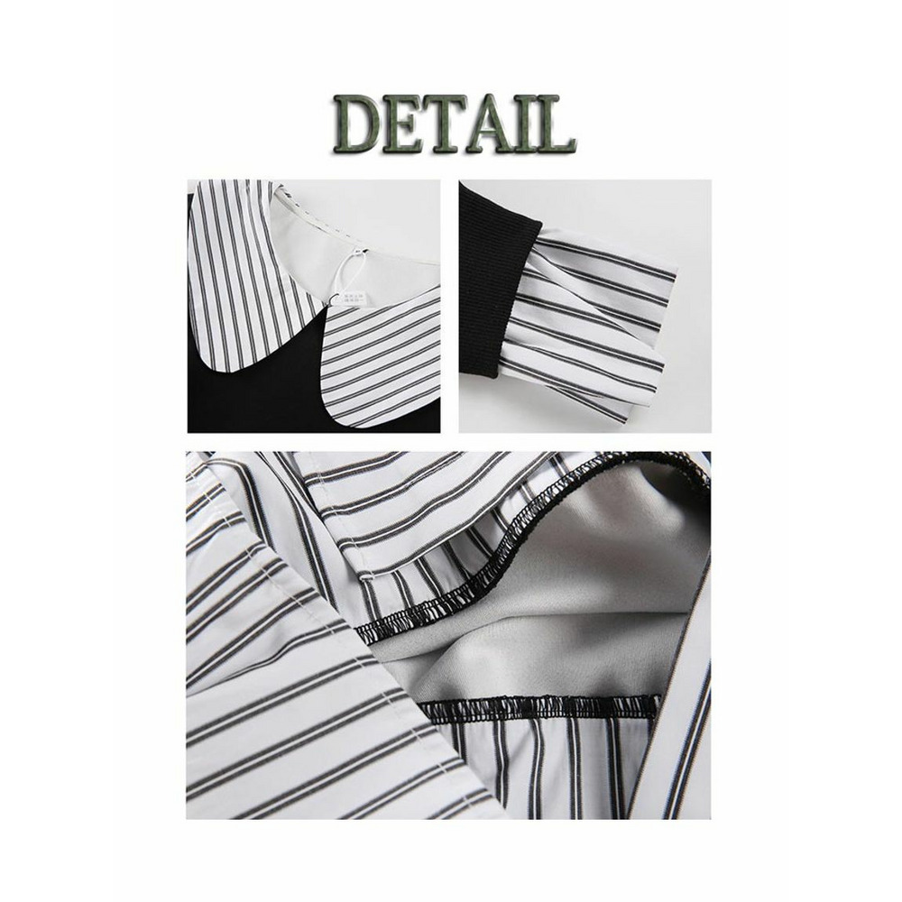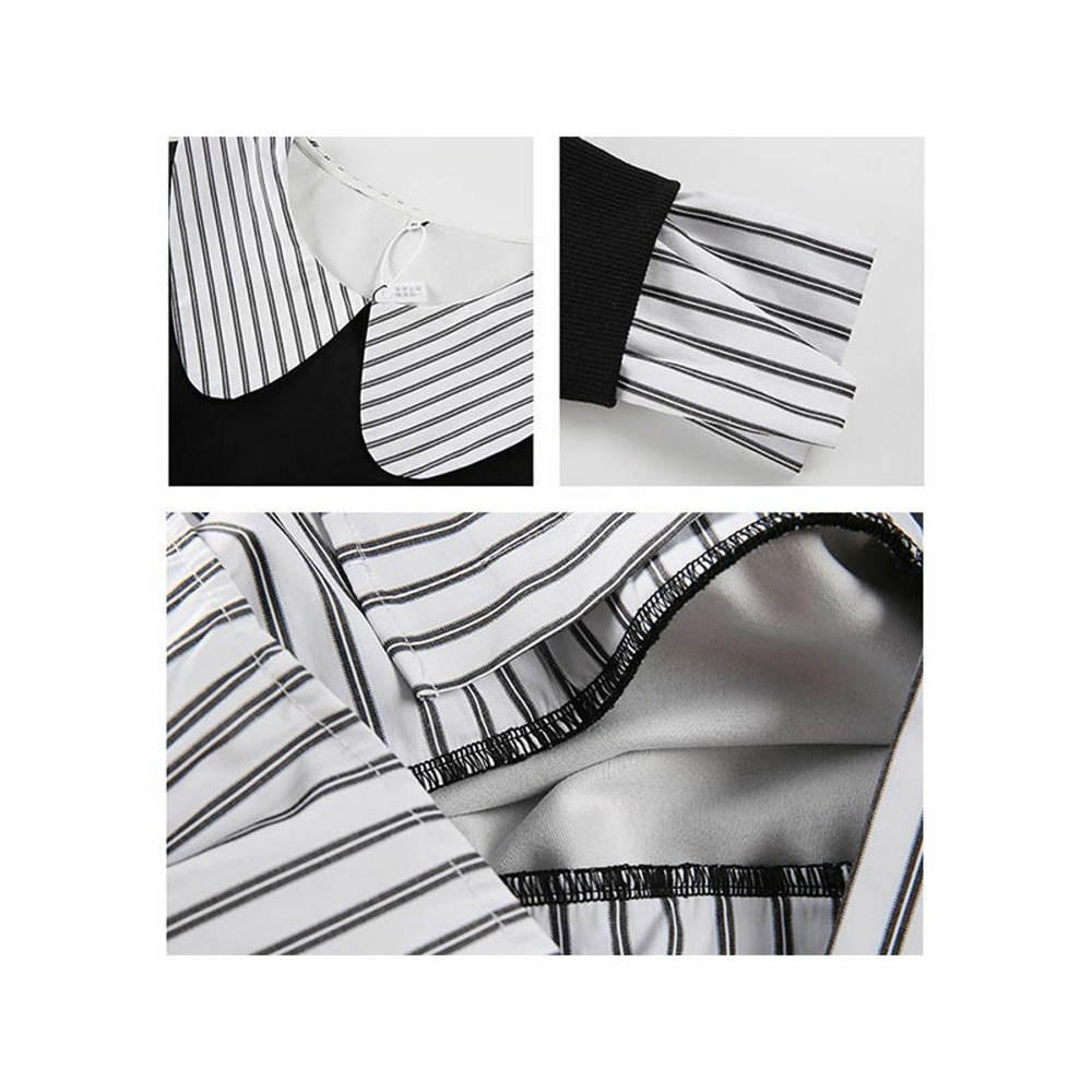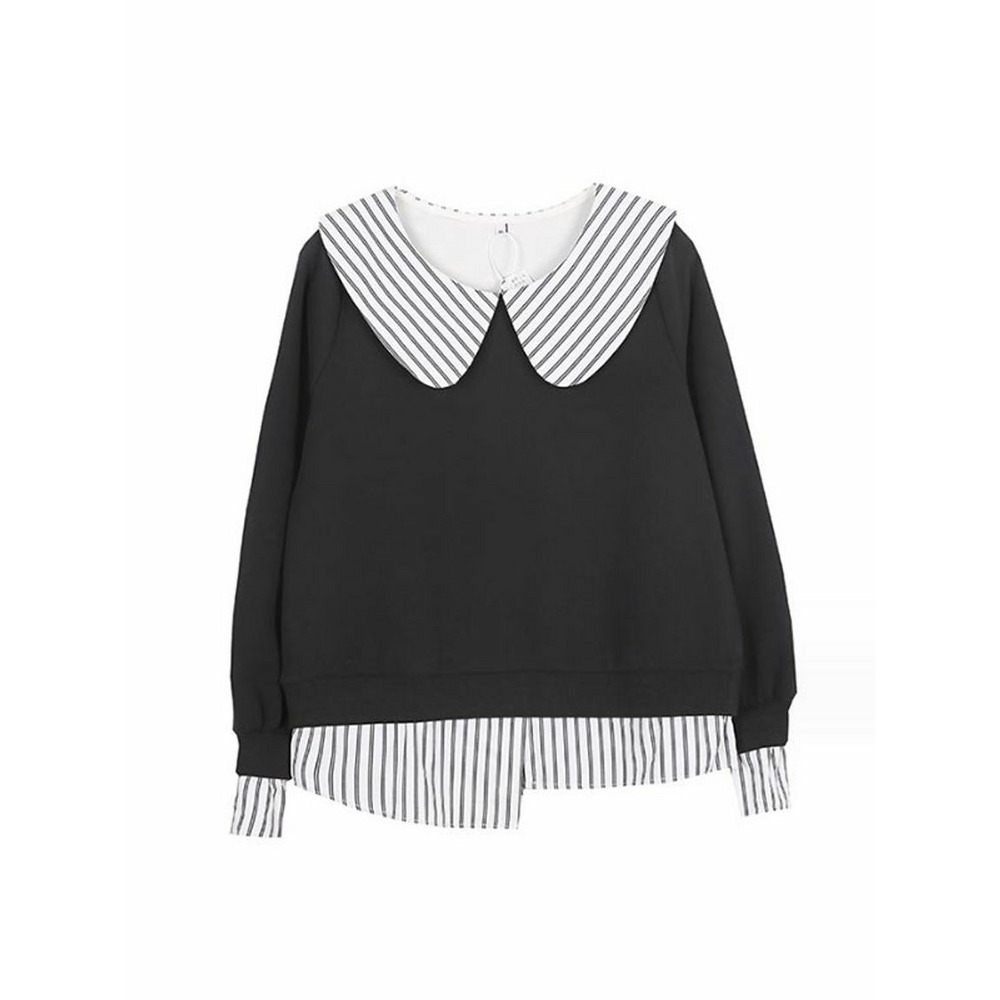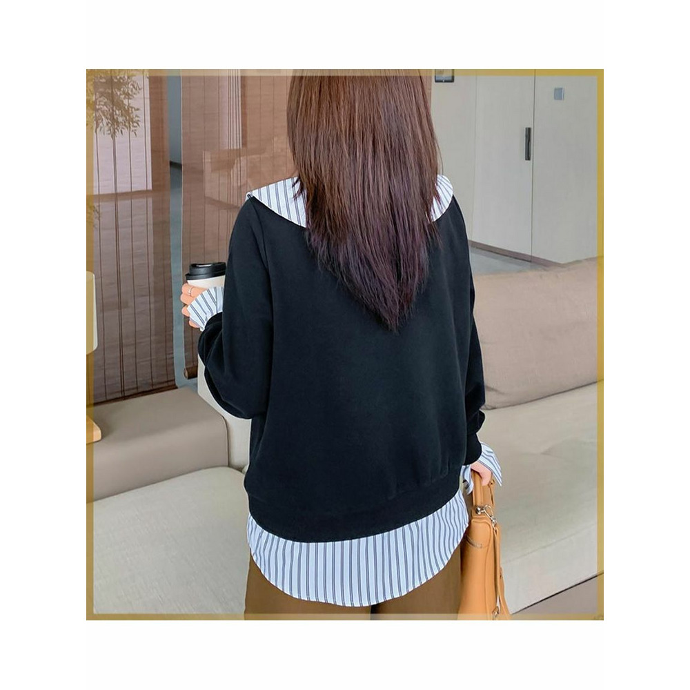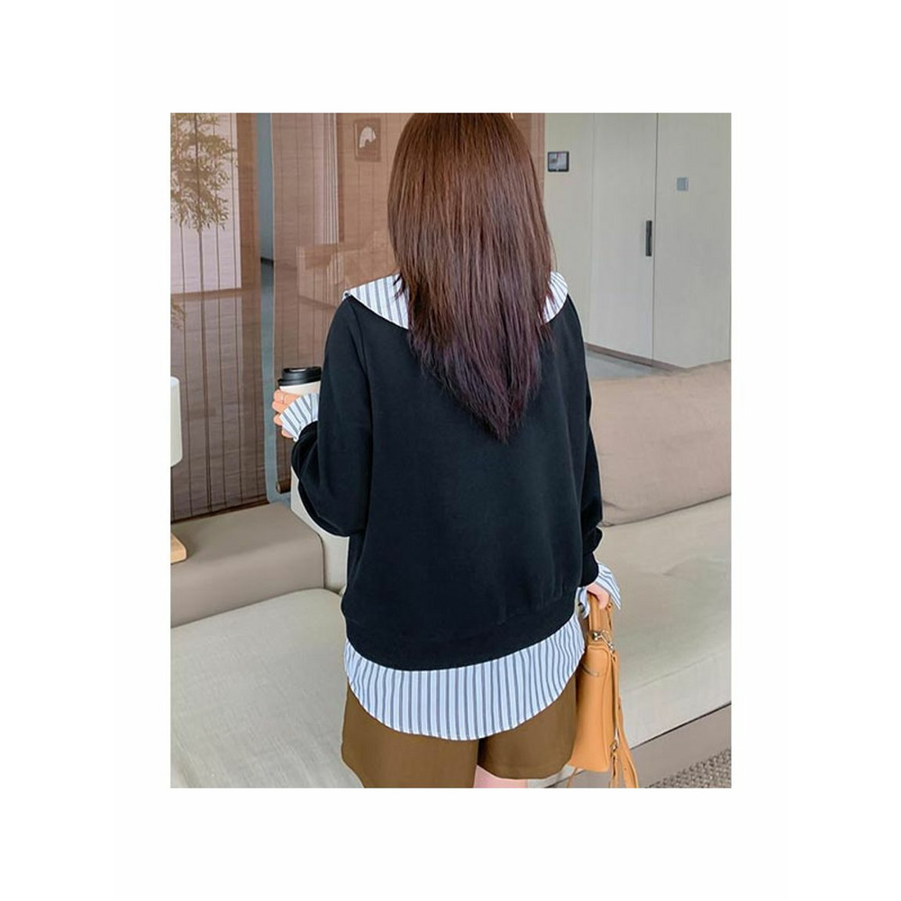 ストライプ柄シャツブラウスの重ね着風スウェットトップス。