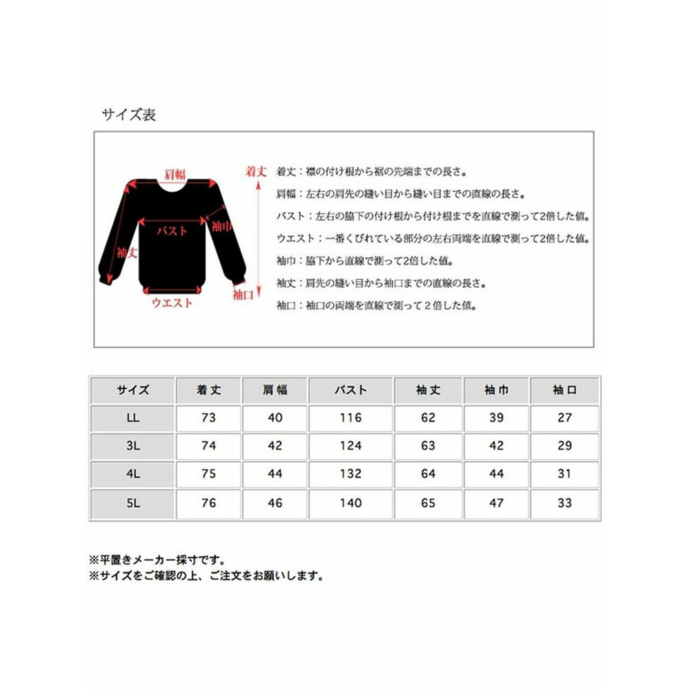 サイズ表記 LL 3L 4L 5L 着丈 73cm 74cm 75cm 76cm 肩幅 40cm 42cm 44cm 46cm バスト 116cm 124cm 132cm 140cm 袖丈 62cm 63cm 64cm 65cm 袖巾 39cm 42cm 44cm 47cm 袖口 27cm 29cm 31cm 33cm