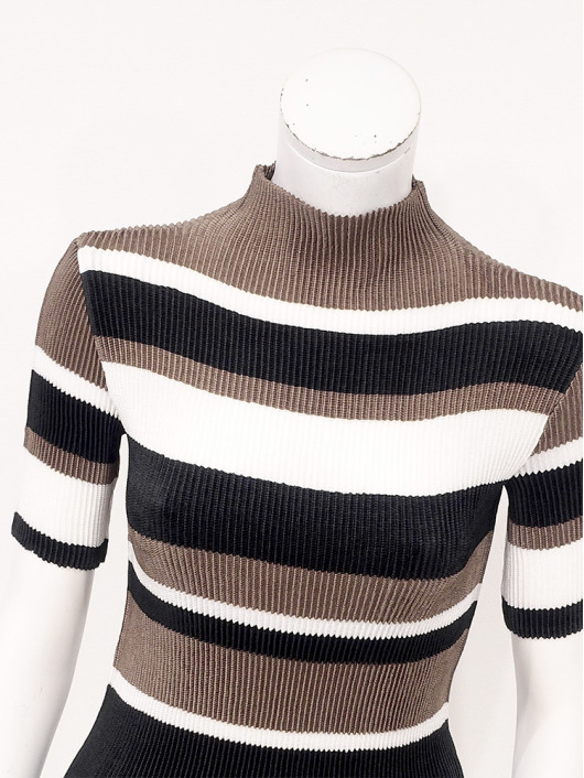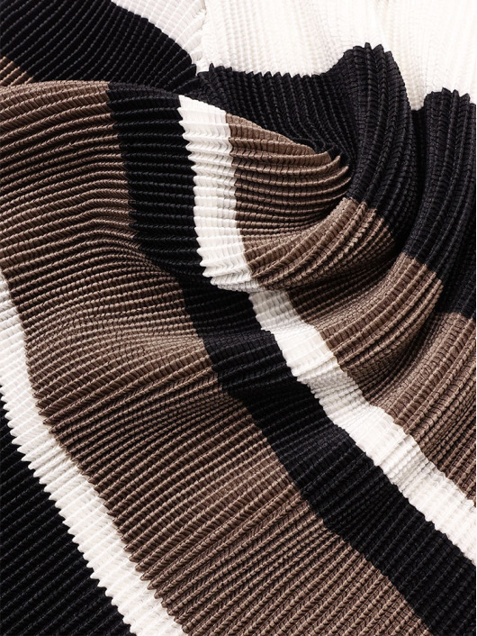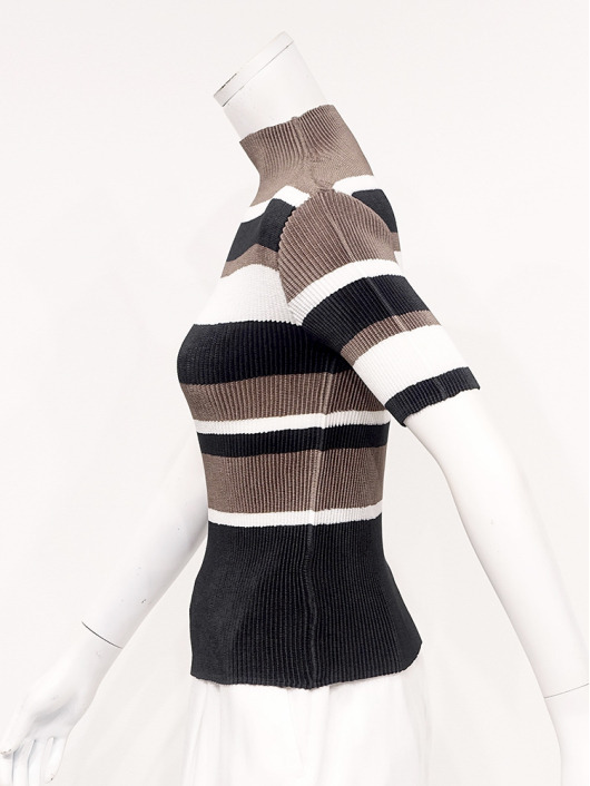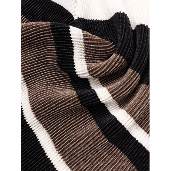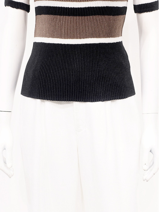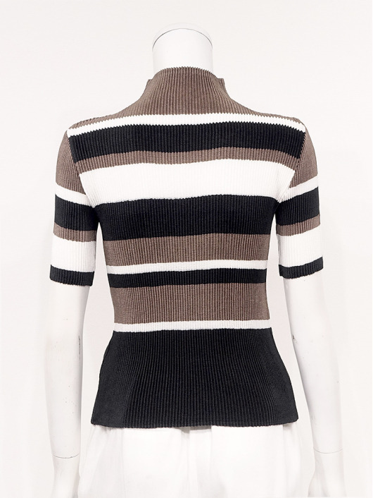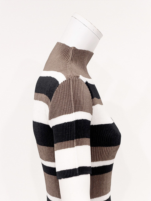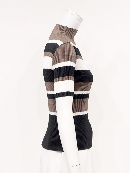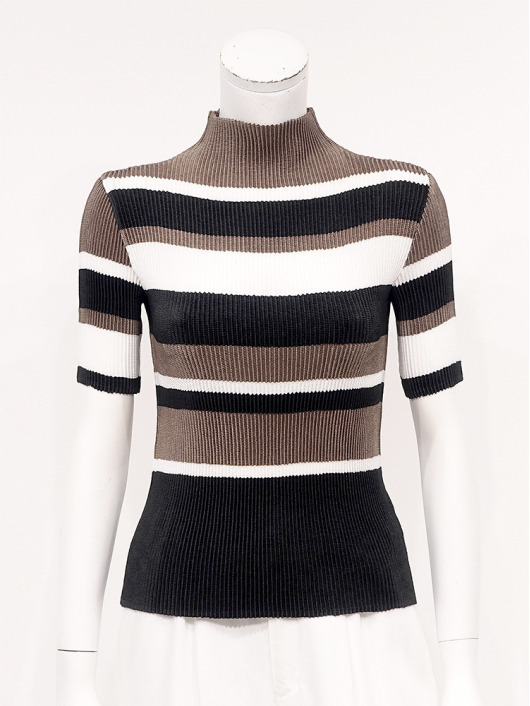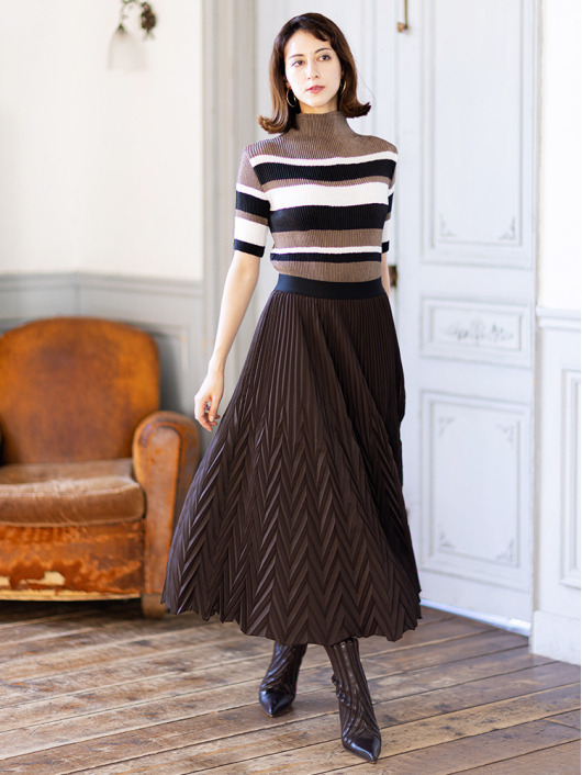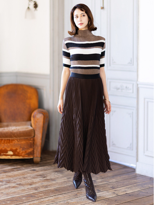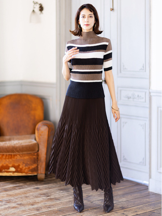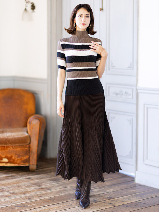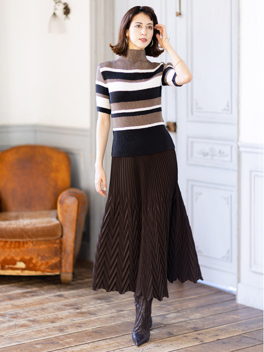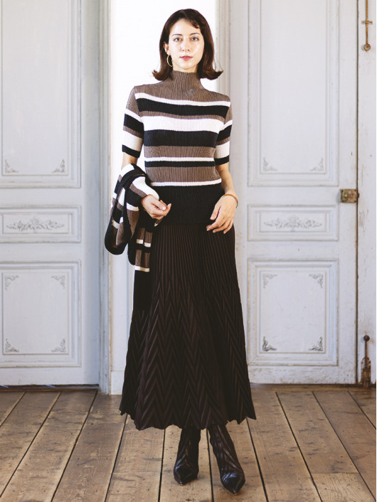 シンプルなコーディネートに取り入れやすいマルチボーダーアクセントは、洗練された色合いのモカムースを主役に白黒配色で上品にまとめています。