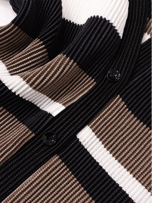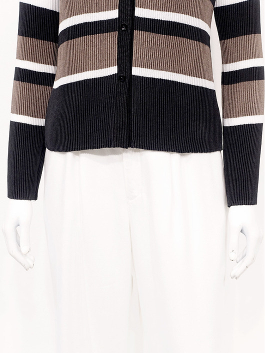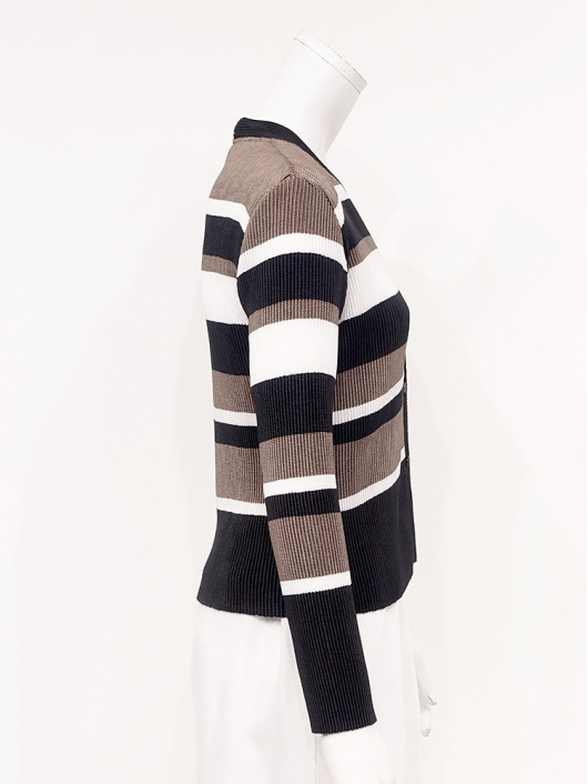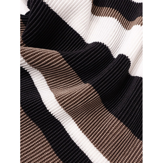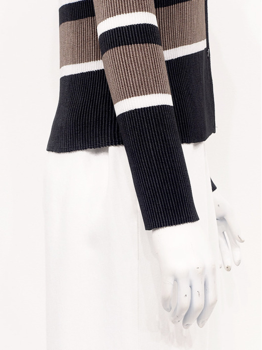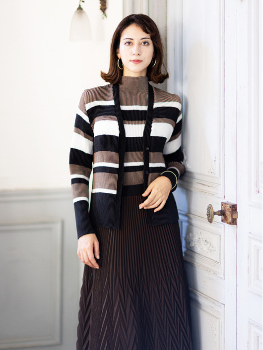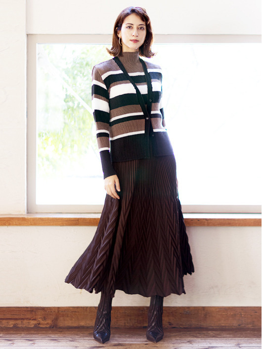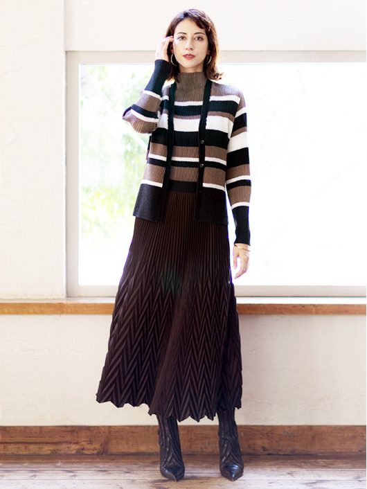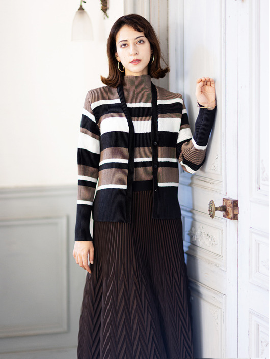 シンプルなコーディネートに取り入れやすいマルチボーダーアクセントは、洗練された色合いのモカムースを主役に白黒配色で上品にまとめています。