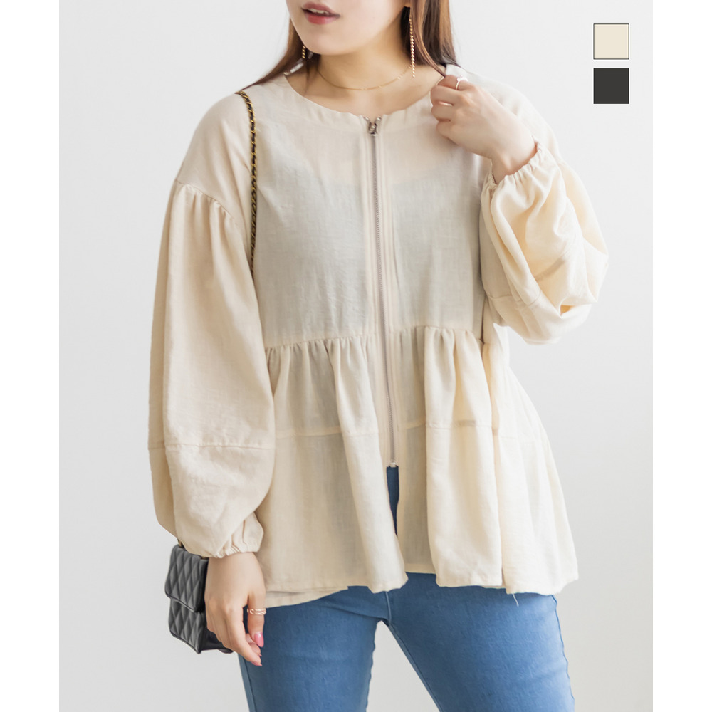 | 3Lサイズを着用しました! 軽やかでさらっとしたリネンライク素材が心地よく、暑い季節にも快適に着られる一枚♪ ジップを閉じればトップス風に、開ければ羽織としても使えるので、着こなしの幅がぐっと広がります◎ ウエスト部分にタックが入っていて、ふんわりと広がるペプラムシルエットが女性らしさを引き立ててくれるのもポイント!ヒップにかかるくらいの丈感で、パンツにもスカートにも合わせやすいのが嬉しい♪ ジップを閉じるとすっきりした印象になり、ハイウエスト位置でメリハリがつくので、スタイルアップ効果も◎ 夏はタンクトップやキャミソールの上にさらっと羽織るのもおすすめ♪ オンオフどちらでも活躍する、大人っぽくこなれ感のあるブルゾンです! |