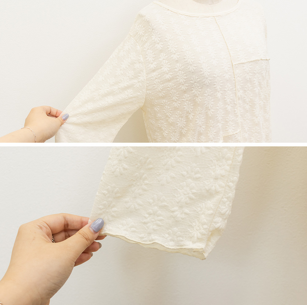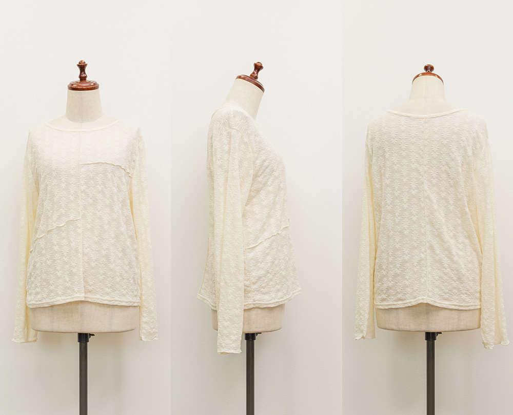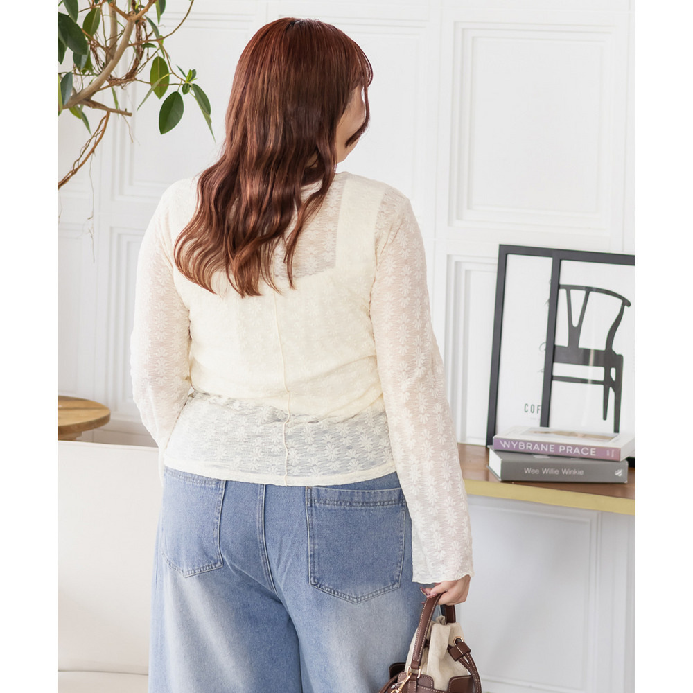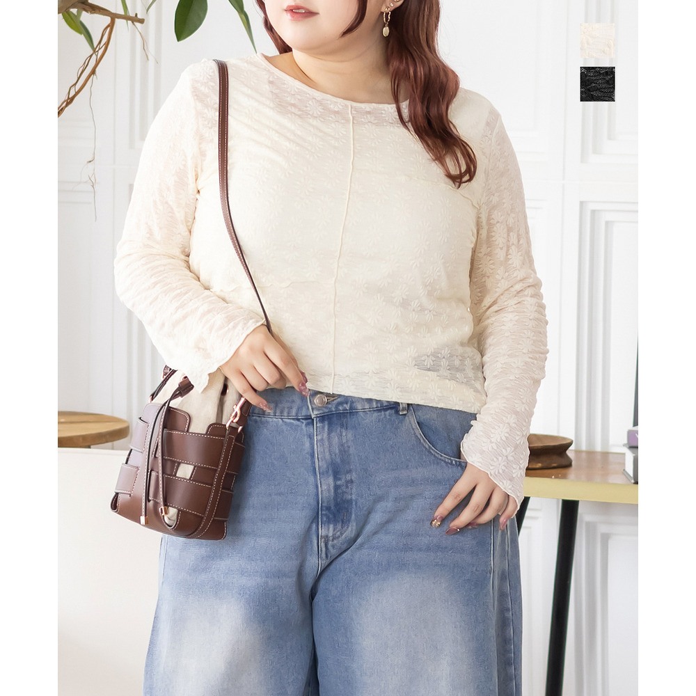 3Lサイズを着用しました。ちょうどいいサイズ感でした◎柔らかなレース素材で伸縮性もあるので、窮屈さはなく着心地も軽やかです。メローデザインの縁取りがさりげなく華やかで、一枚でもレイヤードでも使える万能アイテムだと思いました!パンツ・ワンピース・スカートなどなんにでも合わせられるトップスです♪ |