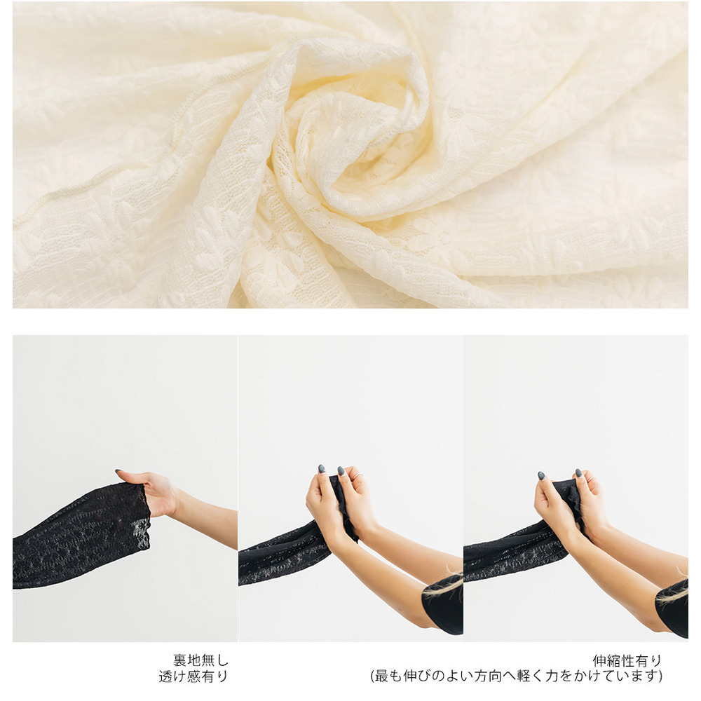 素材 | ■素材 ナイロン75%、ポリウレタン25% ■裏地・透け感・伸縮性 裏地無し、透け感少し有り、伸縮性有り ■ポケット 無し ■生地感 伸縮性表面感のある薄手の素材です。 |