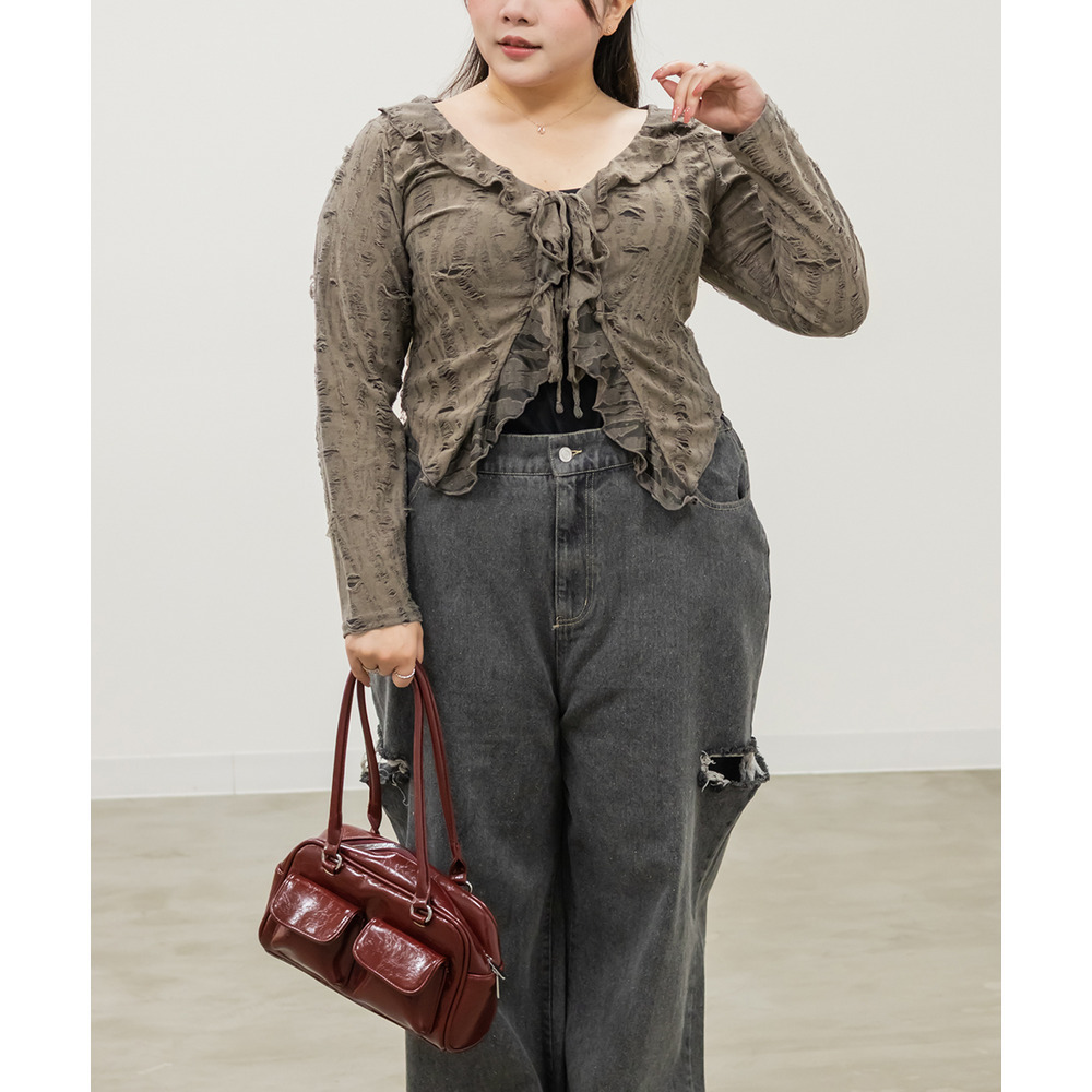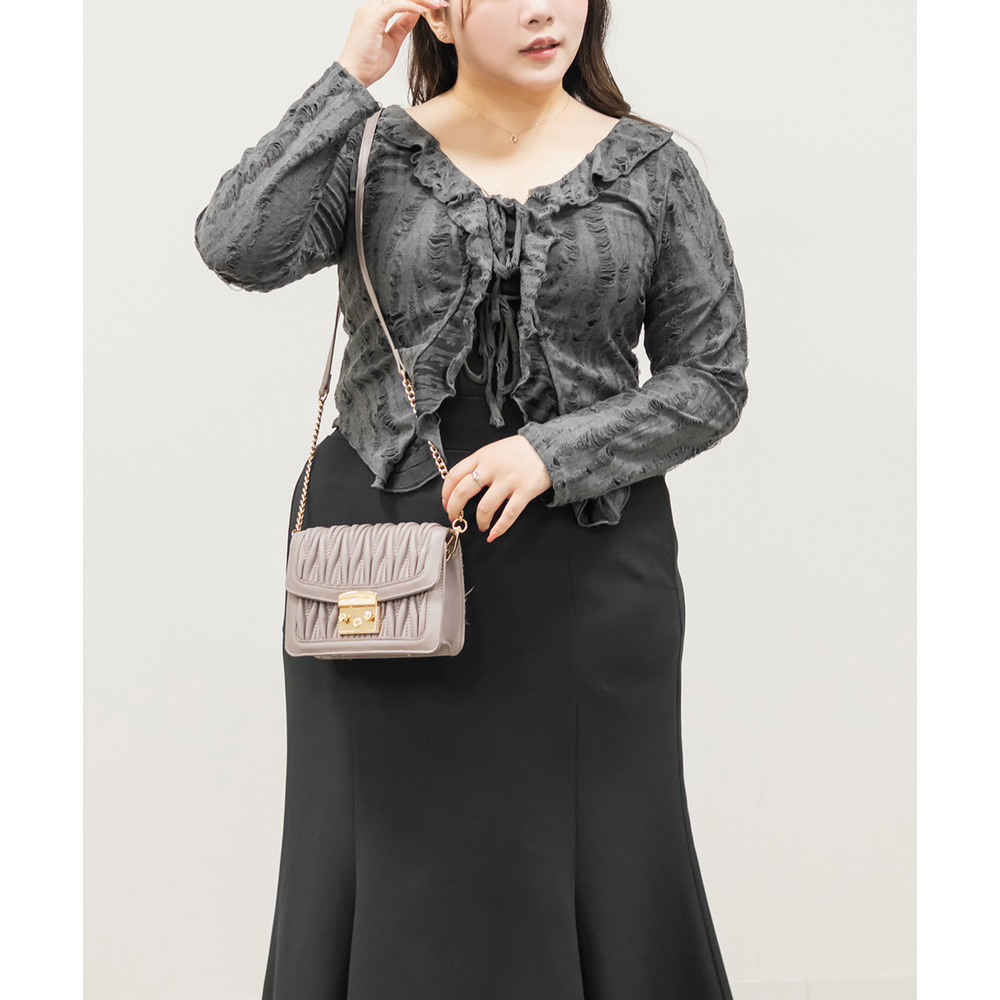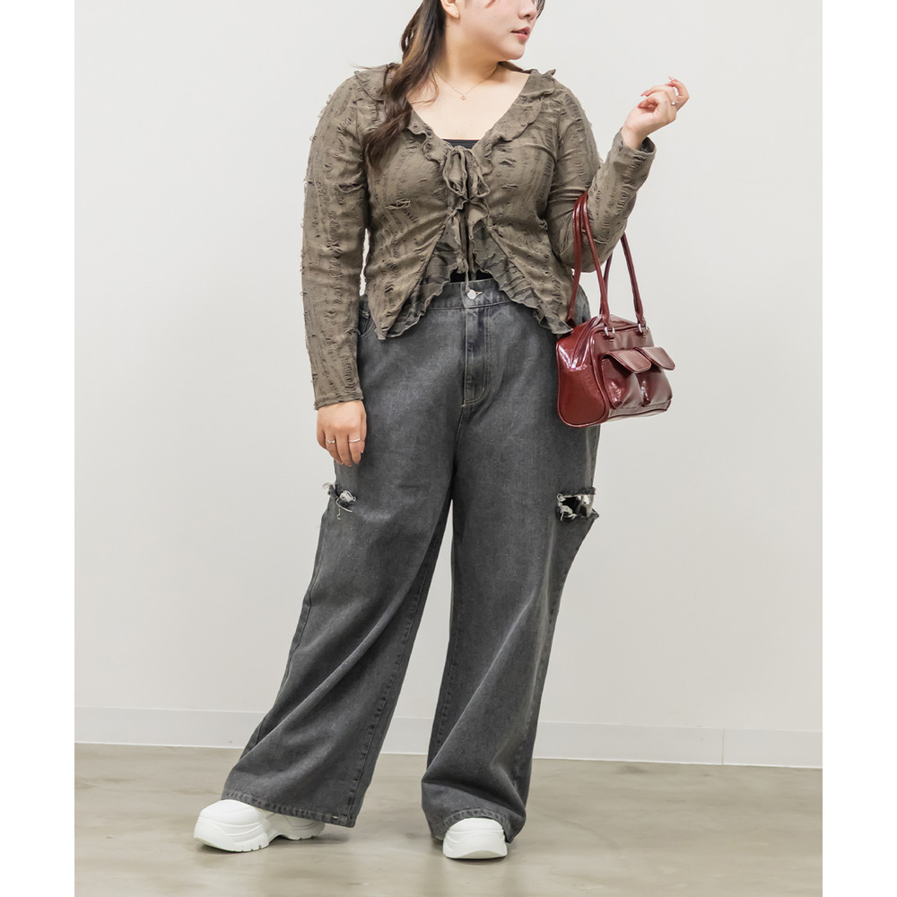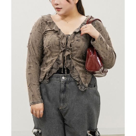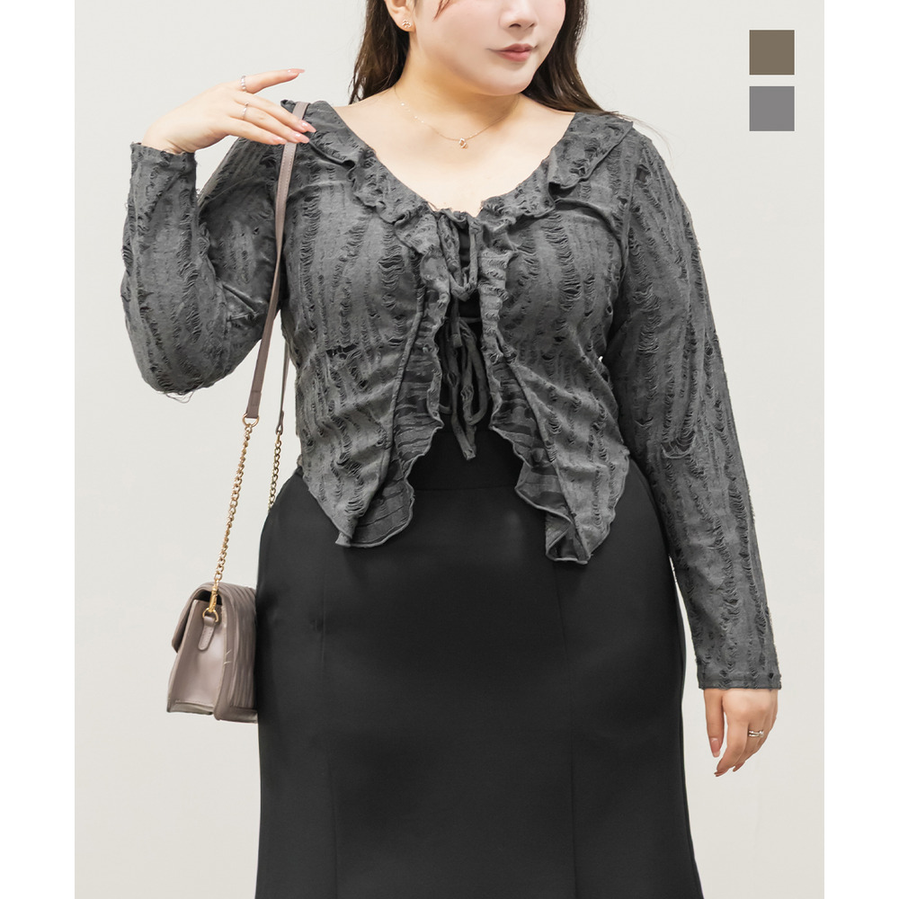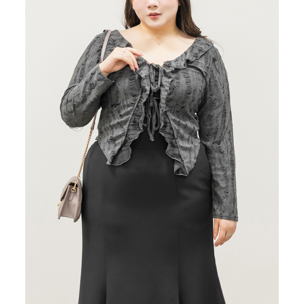 3Lサイズを着用しました!ジャストサイズでゆとりを持って着たい方はワンサイズアップしてもいいかもしれません◎前を留めても窮屈感なく着られました◎フリルとリボンのデザインがポイントになっていて、甘さのある雰囲気が可愛いカーディガンです♪袖や裾のダメージ風カットが甘さの中に抜け感をプラスしてくれて、大人でも着こなしやすい印象です。今っぽい雰囲気もあり可愛いです♪キャミの上からさっと羽織るだけで、コーデが華やかになります! |