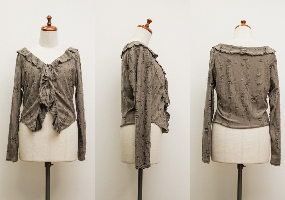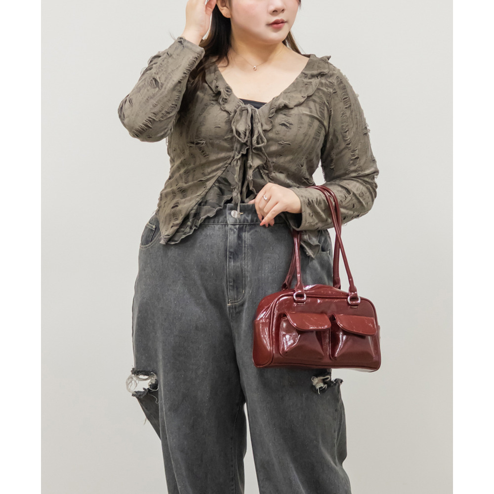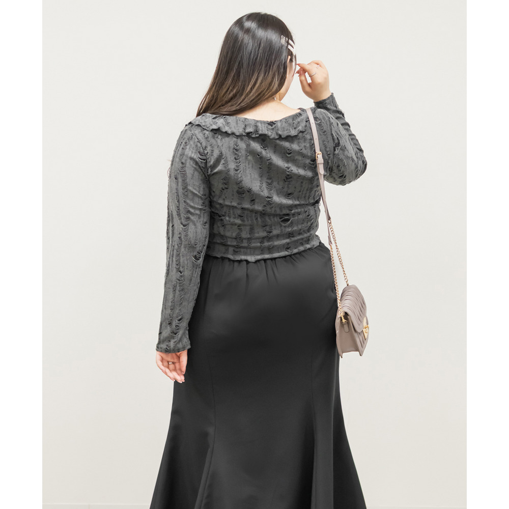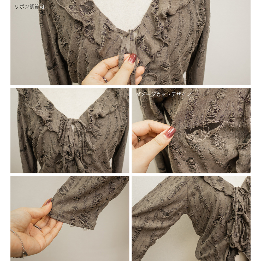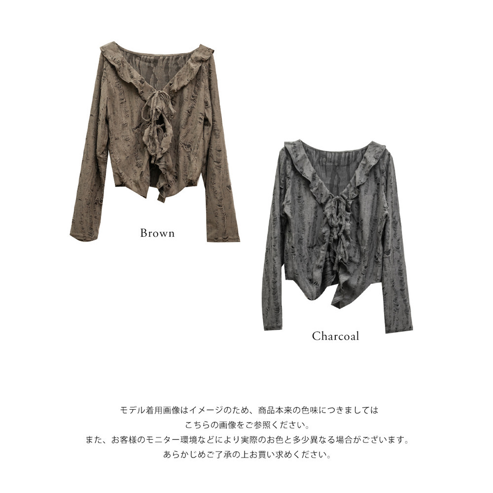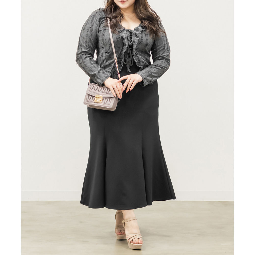 3Lサイズを着用しました!ジャストサイズでゆとりを持って着たい方はワンサイズアップしてもいいかもしれません◎前を留めても窮屈感なく着られました◎フリルとリボンのデザインがポイントになっていて、甘さのある雰囲気が可愛いカーディガンです♪袖や裾のダメージ風カットが甘さの中に抜け感をプラスしてくれて、大人でも着こなしやすい印象です。今っぽい雰囲気もあり可愛いです♪キャミの上からさっと羽織るだけで、コーデが華やかになります! |