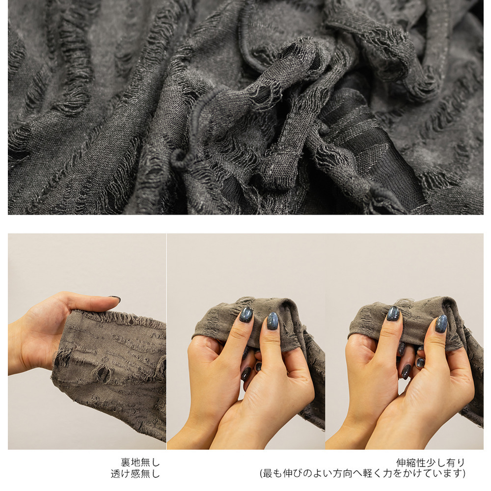 素材 | ■素材 ポリエステル95%、ポリウレタン5% ■裏地・透け感・伸縮性 裏地無し、透け感少し有り、伸縮性わずかに有り ■ポケット 無し ■生地感 ダメージ加工の施された柔らかな素材です。 |
