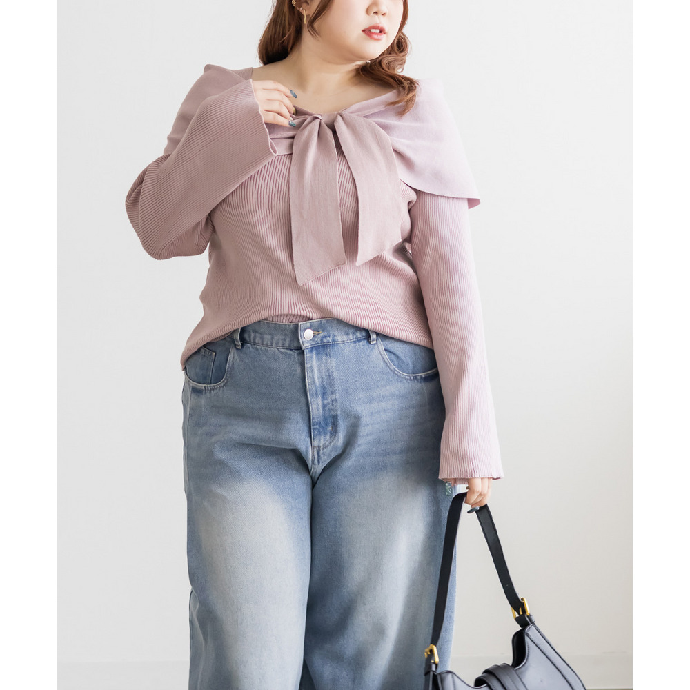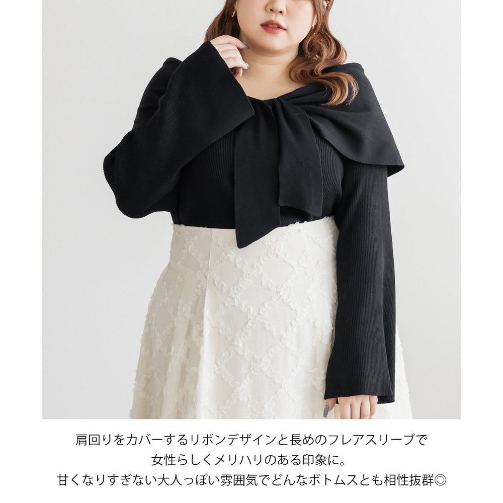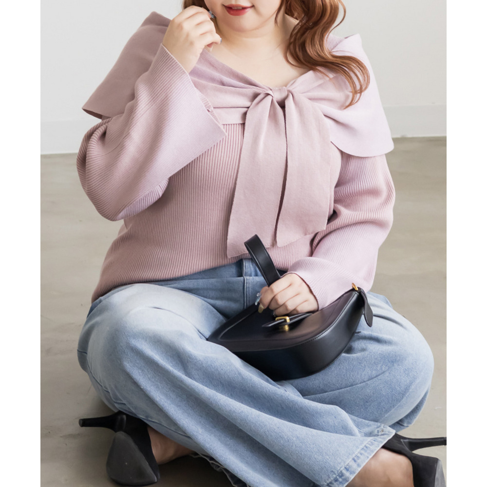 3Lサイズを着用しましたが、窮屈感なくちょうどいいサイズ感で着られました◎柔らかく伸びのいいニット素材で、厚みも少なくごわつかないのが嬉しいです!着心地もおしゃれも妥協しない1枚です!デコルテのおおきめリボンがコーデのアクセントになって、映えるデザインです♪袖丈は長めで袖口に向かって広がるフレアスリーブが手元も美人見えしてくれます。シンプルながらアクセントのある可愛いデザインでデイリー使いにもお出かけやデートにもぴったりです!