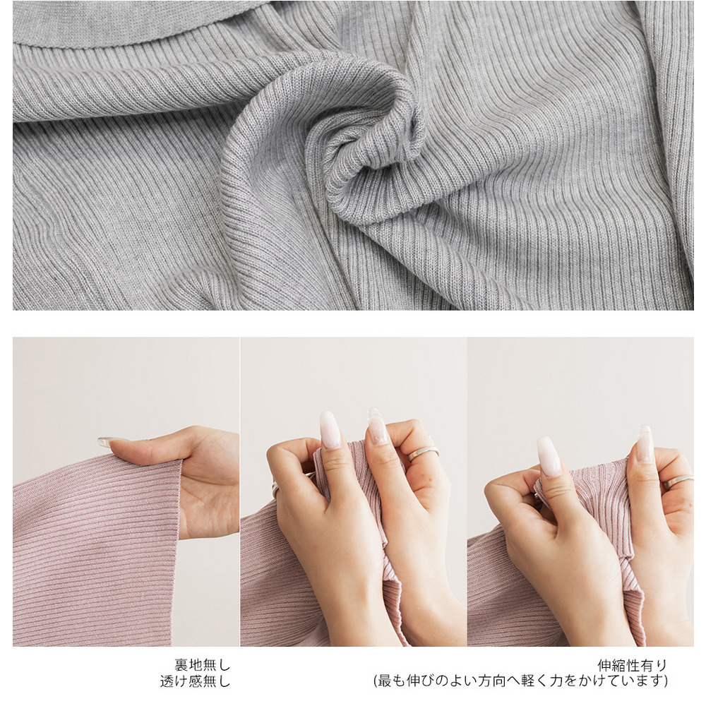 素材 ■素材 レーヨン65%、ナイロン35% ■裏地・透け感・伸縮性 裏地無し、透け感無し、伸縮性有り ■ポケット 無し ■生地感 表面感、落ち感のある柔らかいリブニットです。