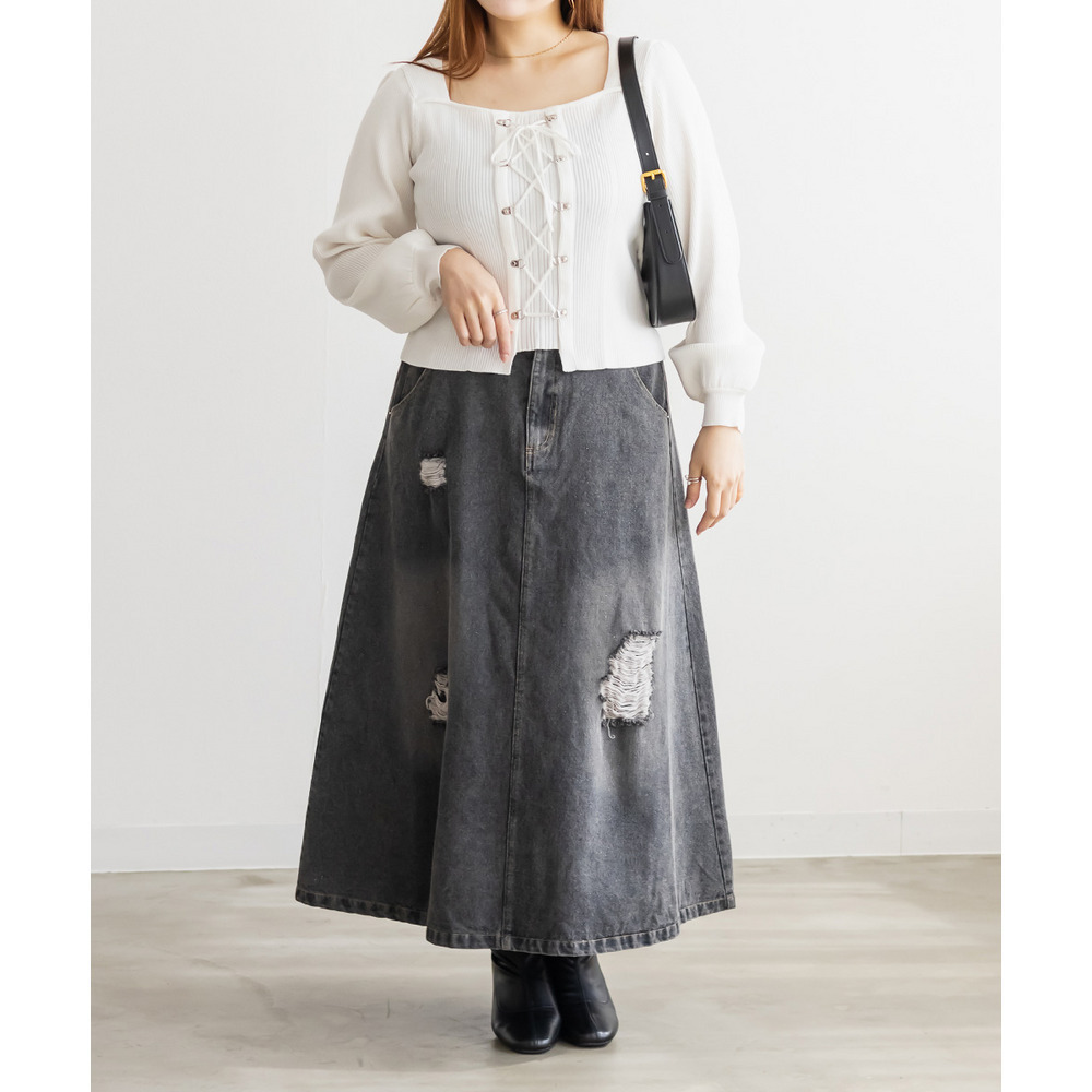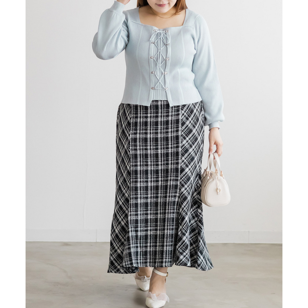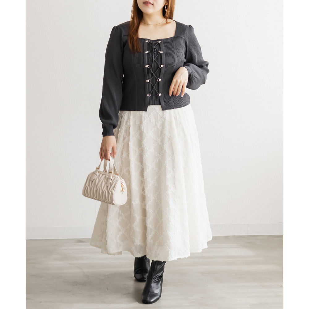 LLサイズを着用してジャストなサイズ感でした。フロントのレースアップが綺麗に出るようジャストで着るのがおすすめです◎すっきりシルエットのトップスですが少しシャリ感のある柔らかなニットで窮屈感なく着られました!レースアップがポイントで縦のラインが強調出来て着やせして見えます!丈感も絶妙でインしなくてもコーデしやすいのもポイントです!秋~春とながく使えるトップスなのであると便利な1枚です!