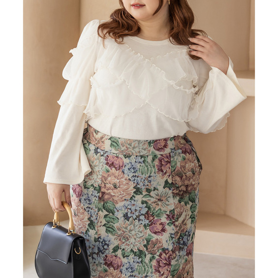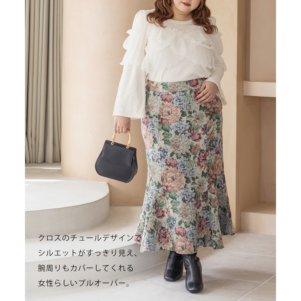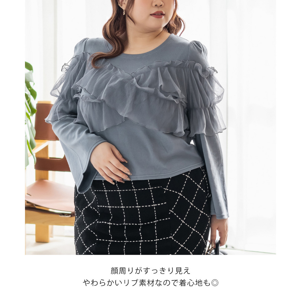 3Lサイズを着用してちょうどいいフィット感で、リブ素材なので体に沿いながらも動きやすかったです!胸元のクロスチュールデザインがポイントになっていて、大人可愛い抜け感を演出してくれます♪生地はしっかり伸びるので、ストレスフリーな着心地でした。裾はインでもアウトでもバランスが取りやすい短め丈で、パンツにもスカートにも合わせやすい万能トップスです!シンプルになりがちなコーデに取り入れるだけで華やかになれるトップスです◎