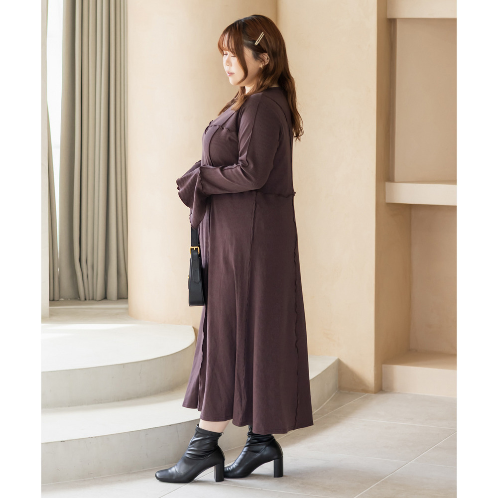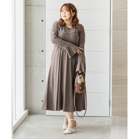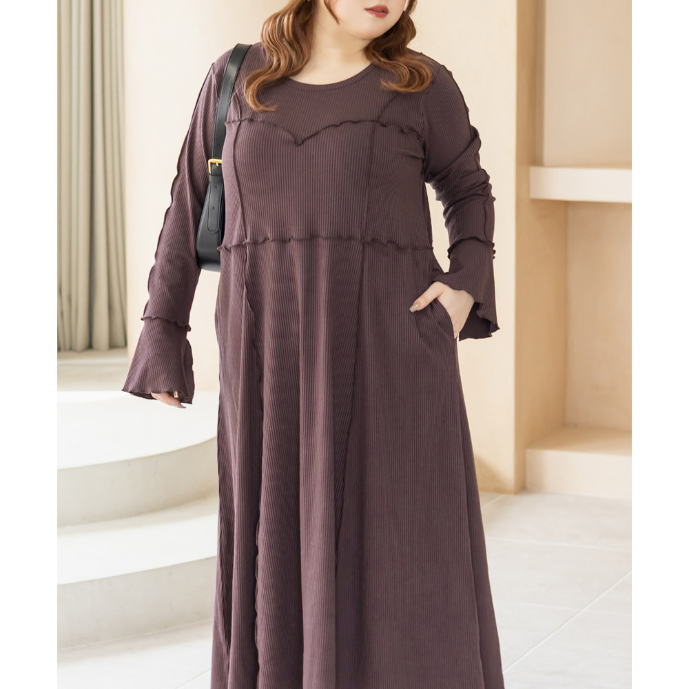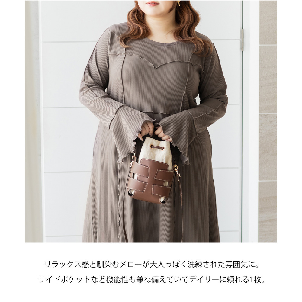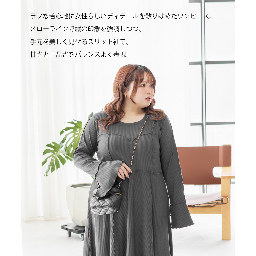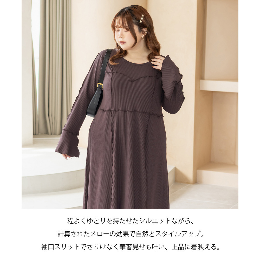 3Lを着用してちょうどいいサイズでした。伸縮性のあるリブ素材だから、着心地とっても楽ちんです!楽だけど、メローラインのおかげですっきりと着やせできるとっても優秀なワンピースです◎メローはワンピースになじむカラーで、カジュアルな生地感だけど大人っぽく洗練された雰囲気で着られました。スリット入りの袖も可愛いです!さらっと着られておしゃれな印象になれて、真夏以外のロングシーズン使えるのもおすすめポイントです!