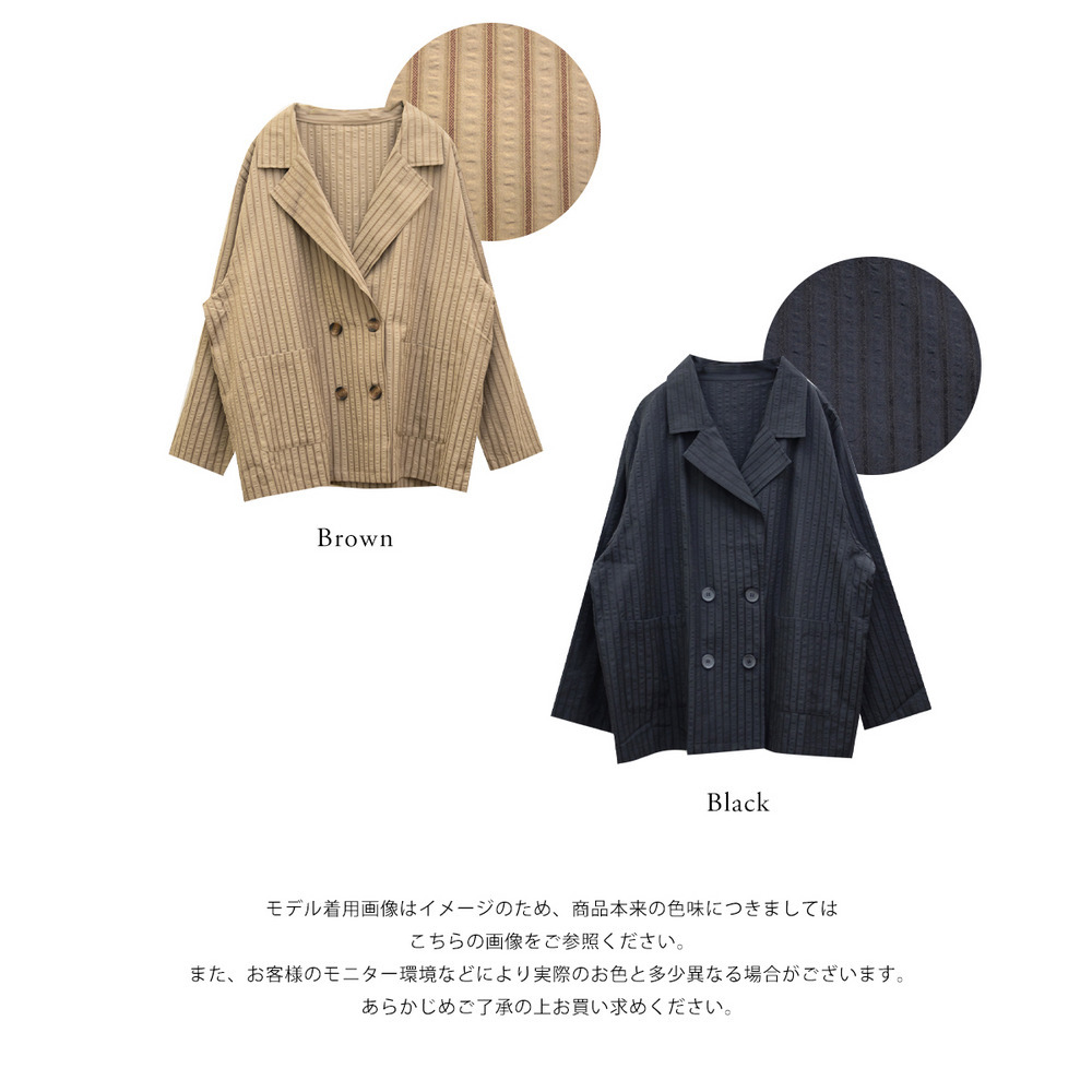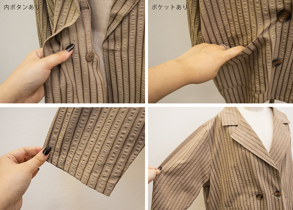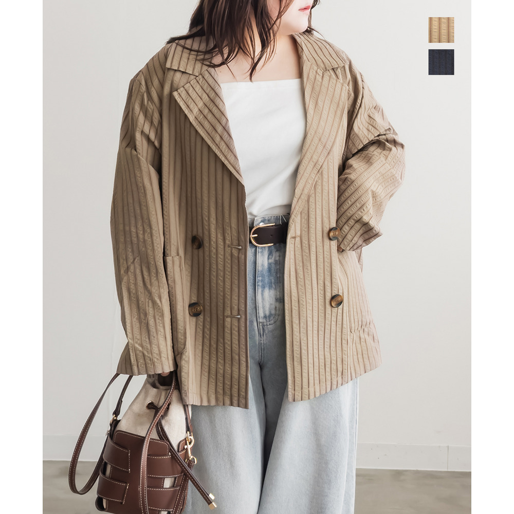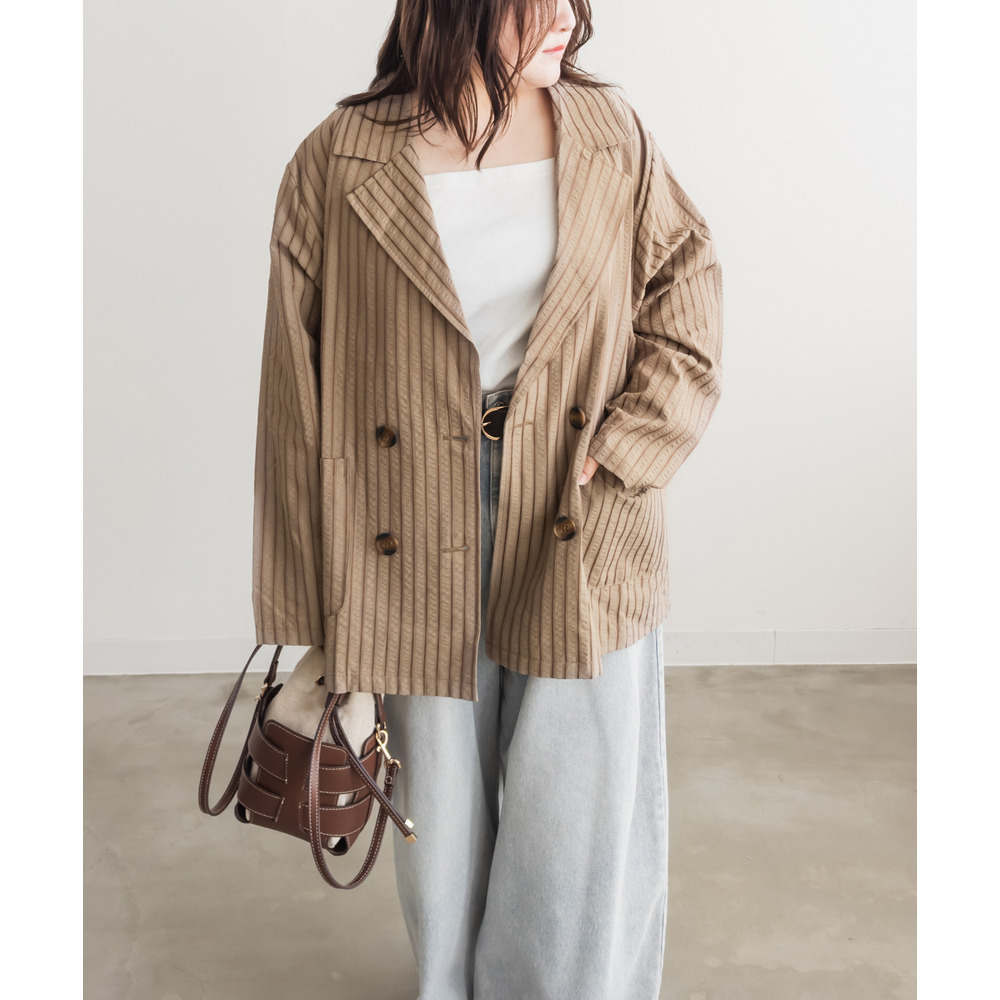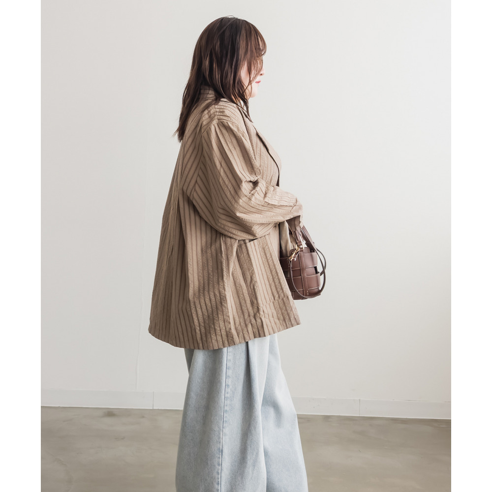 3Lサイズを着用して、程よくゆったりとしたサイズ感でした♪ お尻が隠れるくらいの丈感で、さっと羽織るだけでこなれた雰囲気になります◎ 軽やかな生地感で、長時間着てもストレスフリーな着心地でした! カジュアルにもきれいめにも合わせやすいのが嬉しいポイントで、デニムと合わせてラフに着こなすのはもちろん、スラックスやスカートと合わせてオフィスカジュアルにもぴったりな万能ジャケットです。ストライプ柄が大人っぽくこなれ感たっぷりで、肌寒い季節の羽織に大活躍します! |