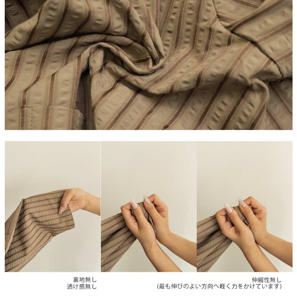 素材 | ■素材 ポリエステル54%、綿41%、レーヨン5% ■裏地・透け感・伸縮性 裏地無し、透け感無し、伸縮性わずかに有り ■ポケット 有り ■生地感 程よい薄手で凹凸のある素材です。 |