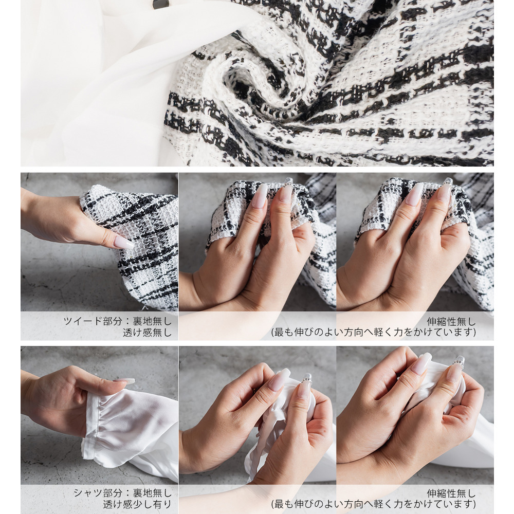 素材 | ■素材 【本体】ポリエステル76%、綿16%、レーヨン6%、その他2%、【配色部分】ポリエステル100% ■裏地・透け感・伸縮性 シャツ部分:裏地無し、透け感少し有り、伸縮性無し / ツイード部分:裏地無し、透け感無し、伸縮性無し ■ポケット 無し ■生地感 シャツ部分:さらっと滑らかな素材です。 ツイード部分:表面感のある程よく軽いツイード素材です。 |