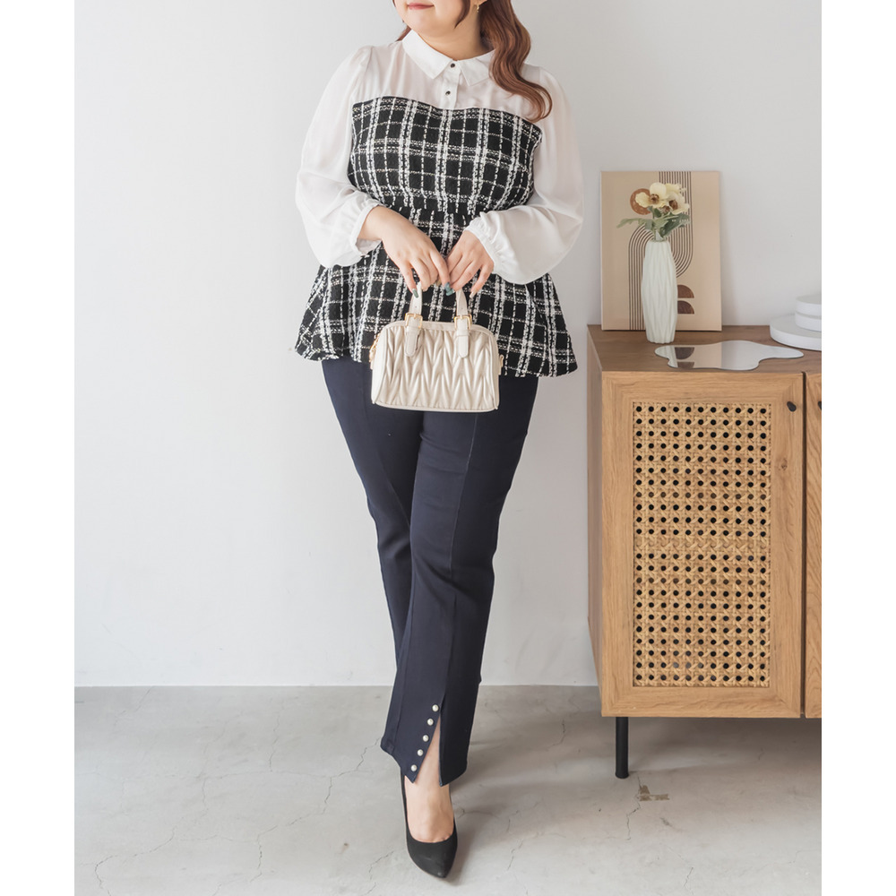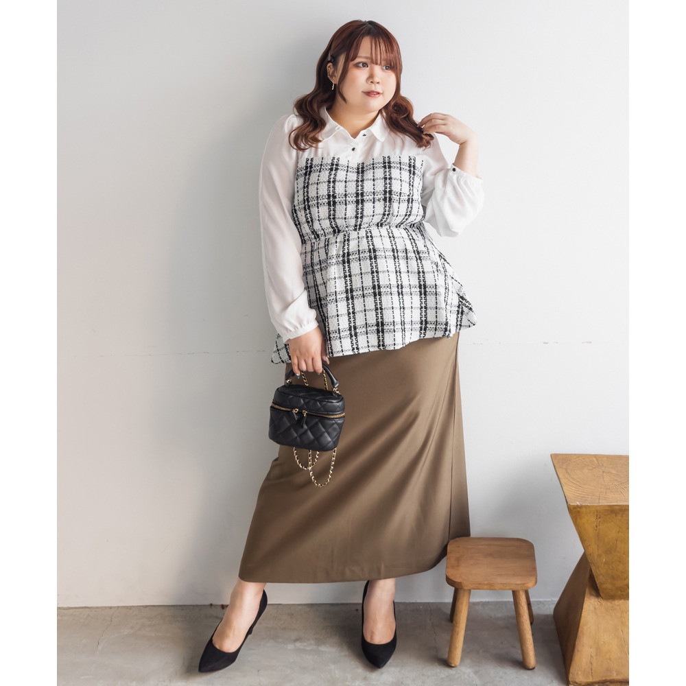3Lサイズを着用してちょうどいいサイズ感でした。窮屈感も無かったのでいつも通りのサイズ選びで問題なさそうです◎ウエスト位置が高く見えるペプラム切替で、おなか周りらくちんなのにスタイルアップ見えするのが魅力のブラウスです!上品で華やかな色味のツイードがお仕事でも普段使いでも着回ししていただけます!袖の長さは調節できるようになっているので、長いシーズン着回しできます♪ |