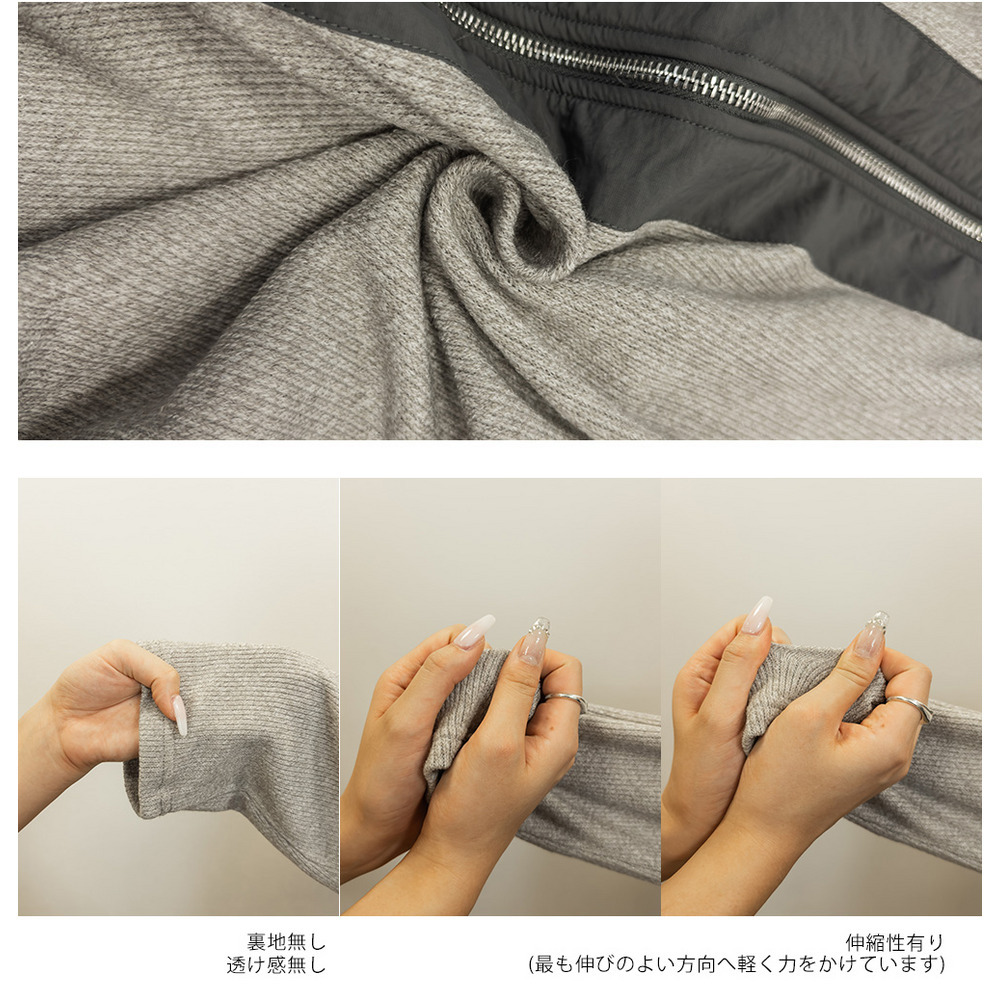 素材 | ■素材 【本体】ポリエステル80%、レーヨン15%、ポリウレタン5%、【別布部分】ナイロン100% ■裏地・透け感・伸縮性 本体:裏地無し、透け感無し、伸縮性有り / 別布部分:裏地無し、透け感無し、伸縮性無し ■ポケット 無し ■生地感 程よく薄手のしっかりとしたニットです。 |