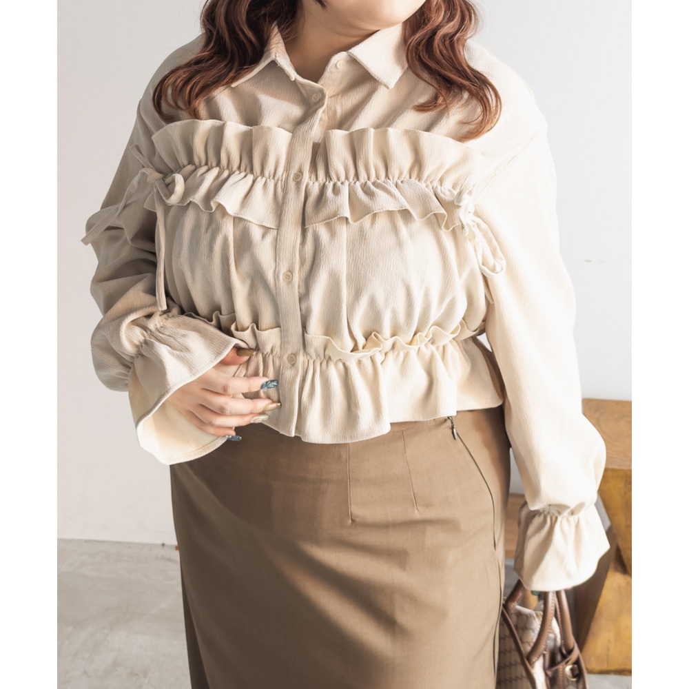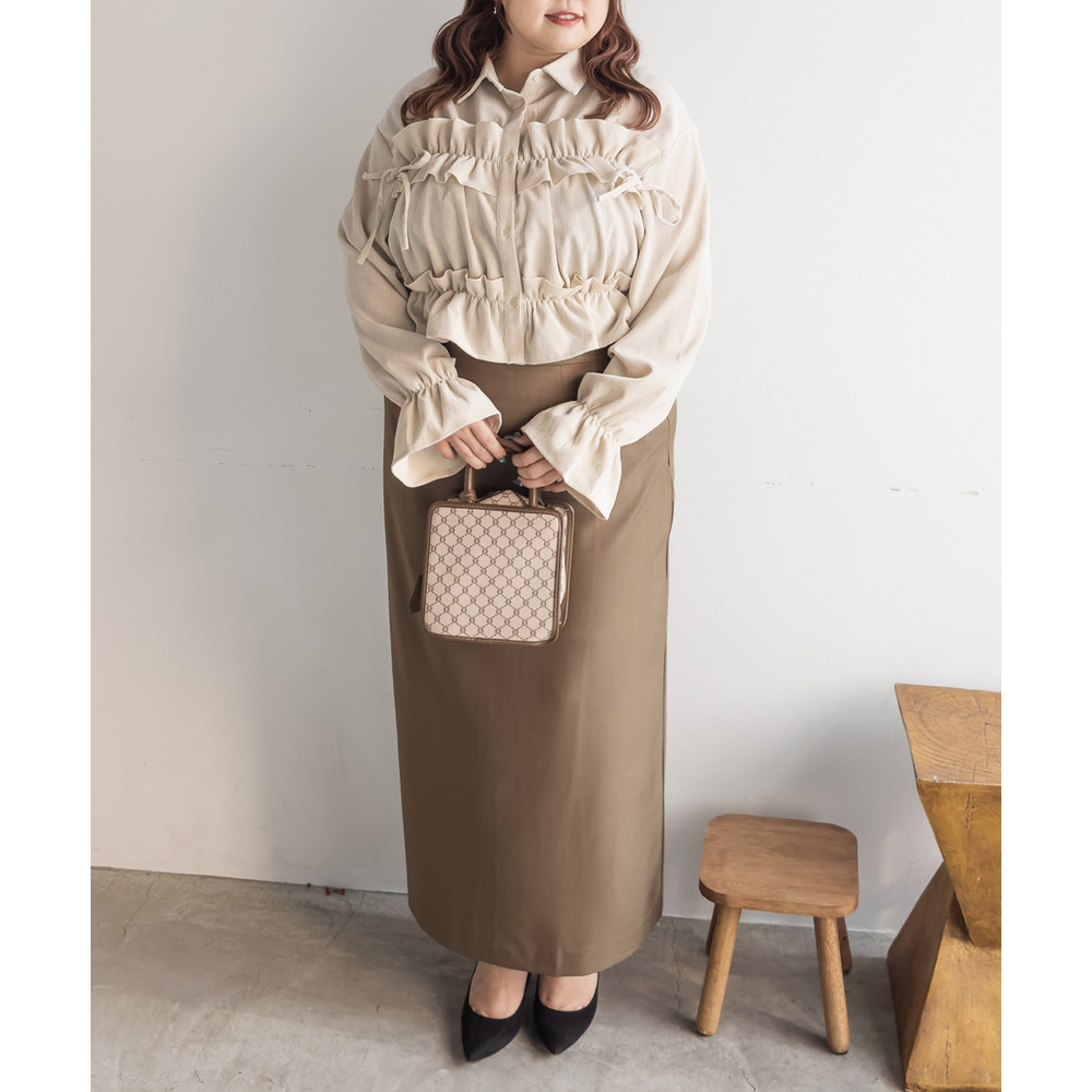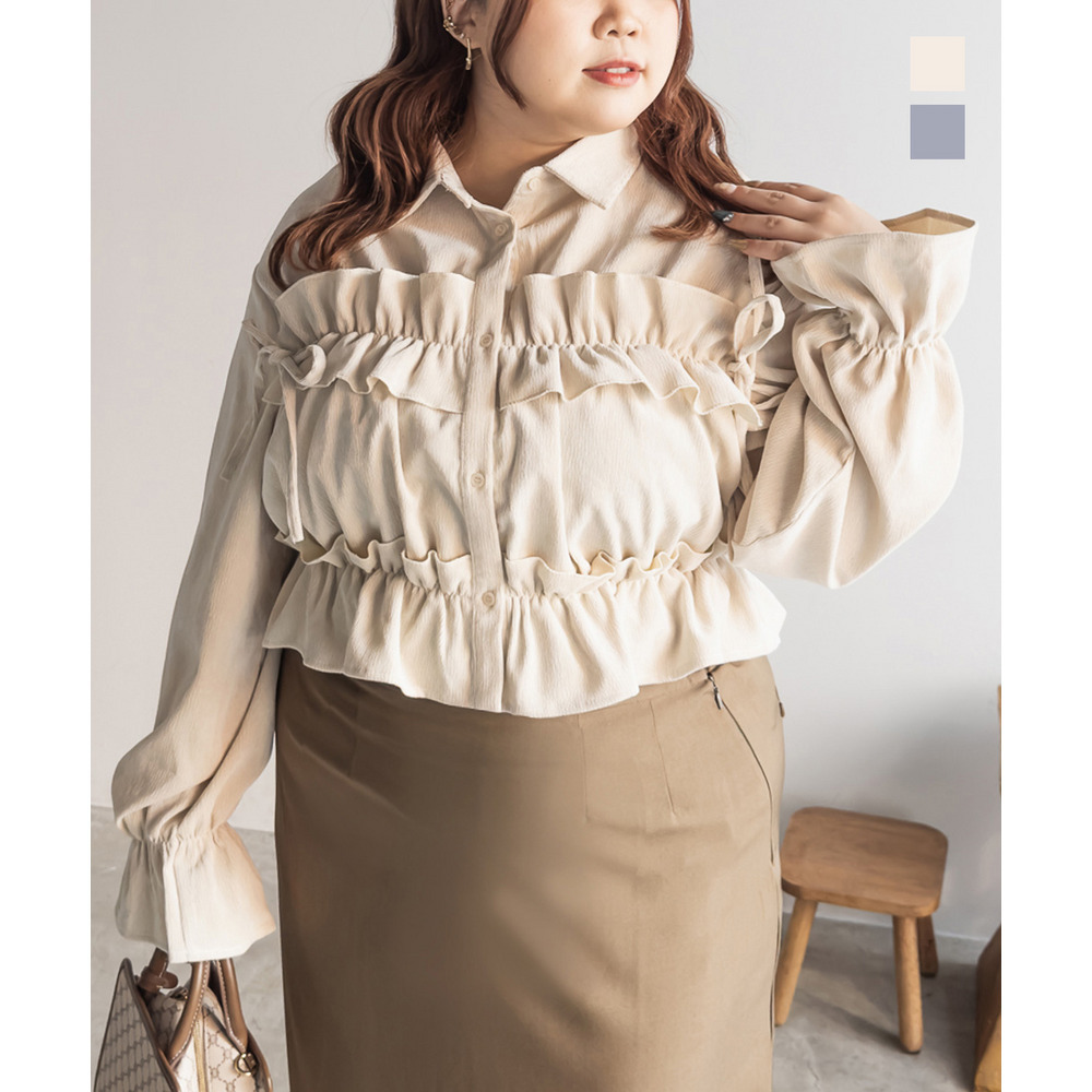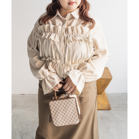 3Lサイズを着用して、ちょうどいいサイズ感でした。ウエスト部分のギャザーが程よくフィットし、メリハリのあるシルエットに♪ ふんわりとしたキャンディースリーブとリボンデザインが華やかで、シンプルなボトムスと合わせるだけで存在感のあるコーデが完成します。丈感はやや短めなので、ハイウエストのパンツやスカートと相性◎ きちんと感がありながらも、程よい甘さのあるデザインなので、大人フェミニンなスタイルにぴったりな一枚です。