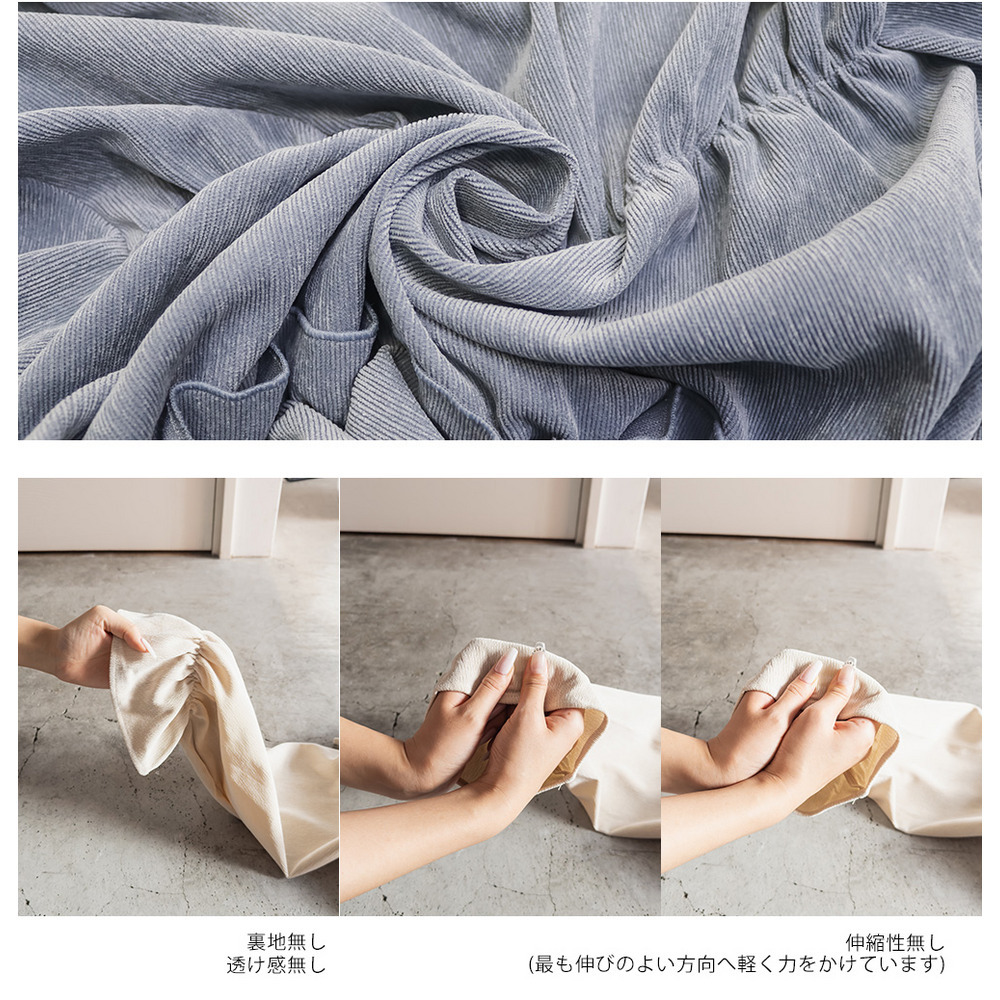 素材 ■素材 ポリエステル90%、ナイロン7%、ポリウレタン3% ■裏地・透け感・伸縮性 裏地無し、透け感無し、伸縮性無し ■ポケット 無し ■生地感 薄手のコーデュロイ素材です。