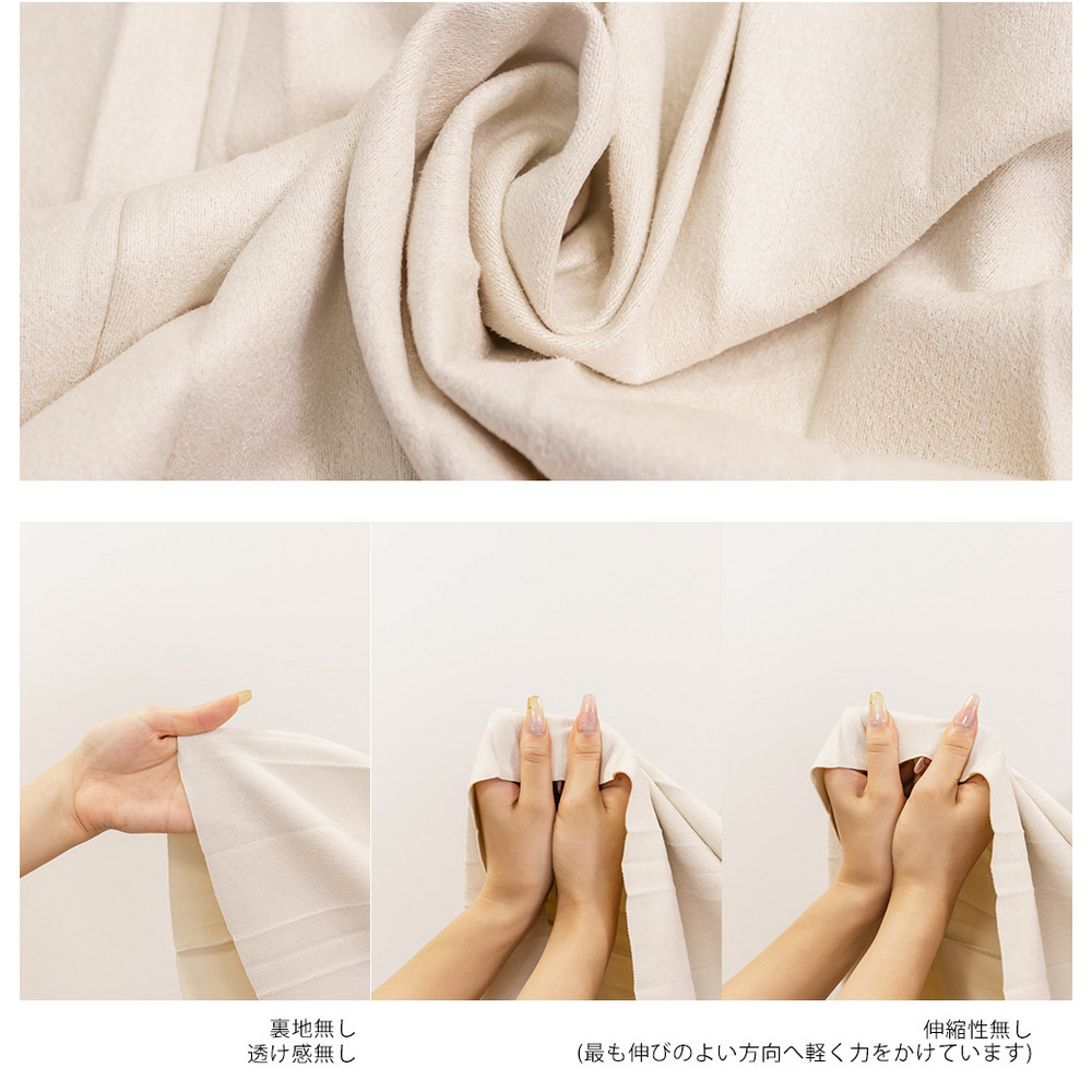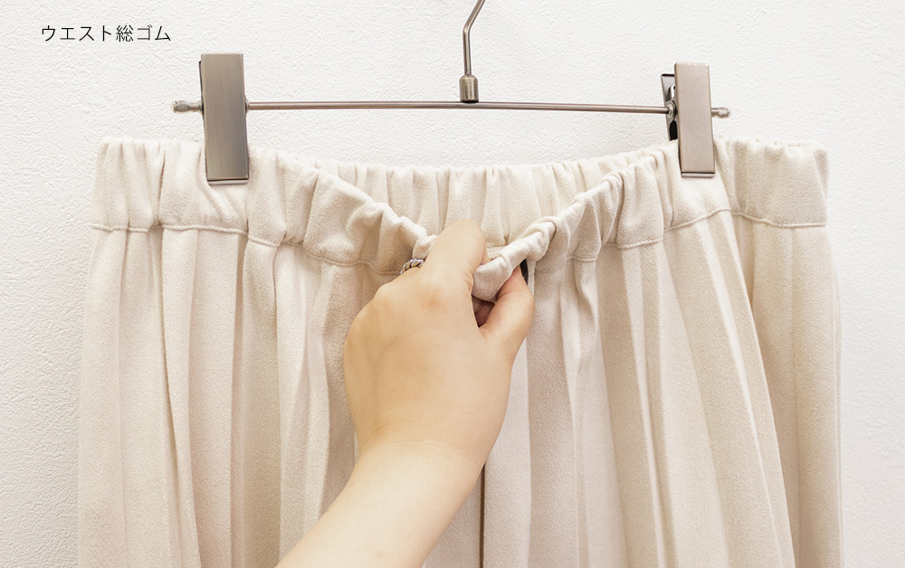 素材 ■素材 ポリエステル95%、ポリウレタン5% ■裏地・透け感・伸縮性 裏地無し、透け感無し、伸縮性無し ■ポケット 無し ■生地感 プリーツ加工の施された薄手のスエード素材です。