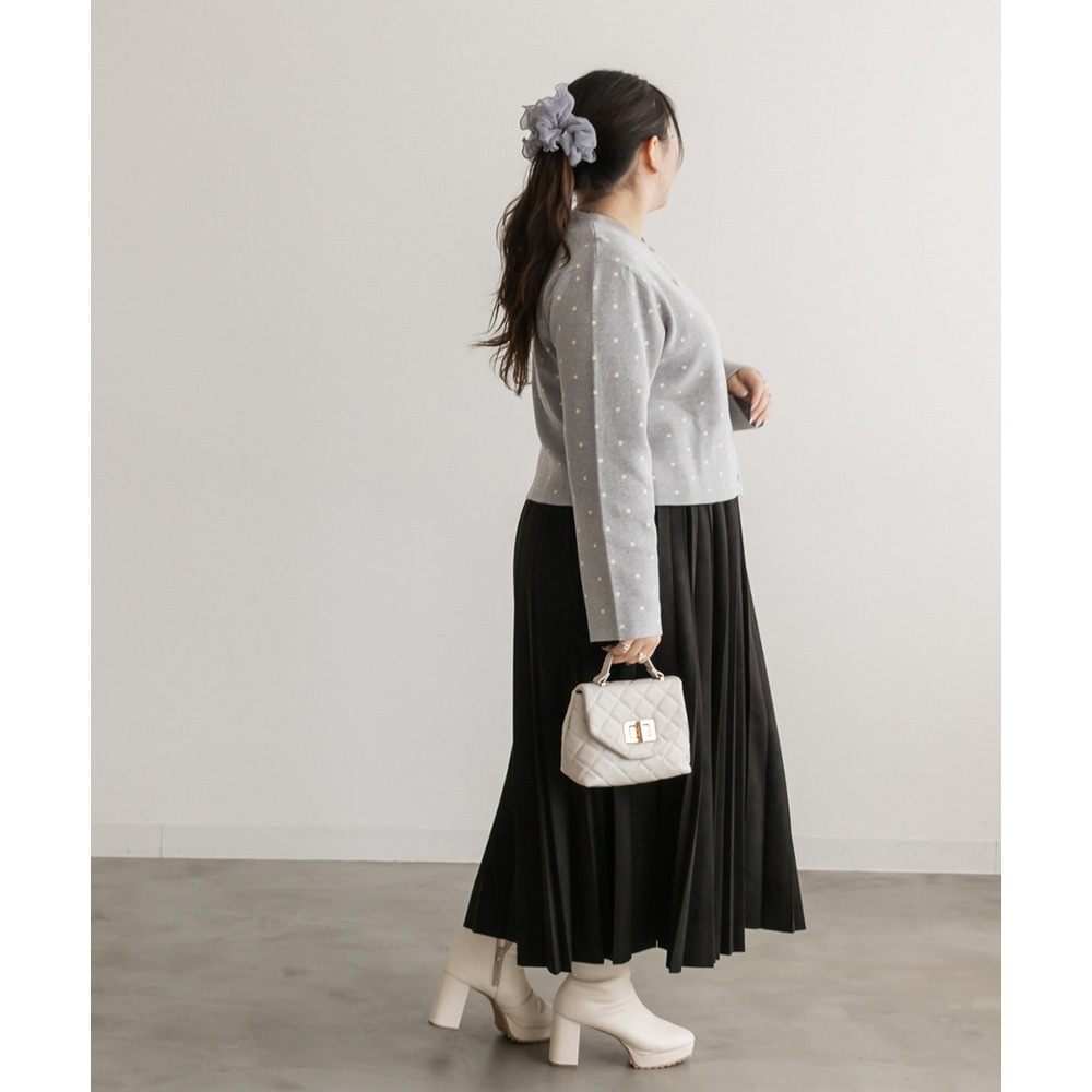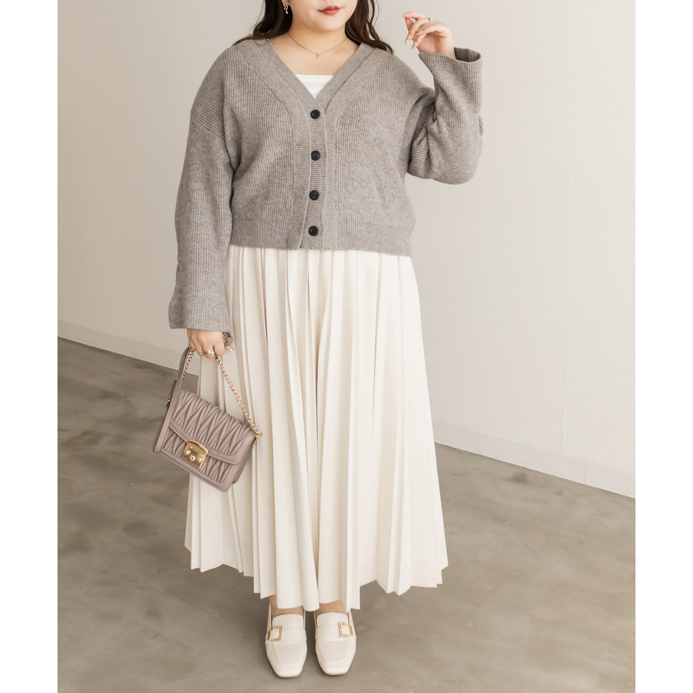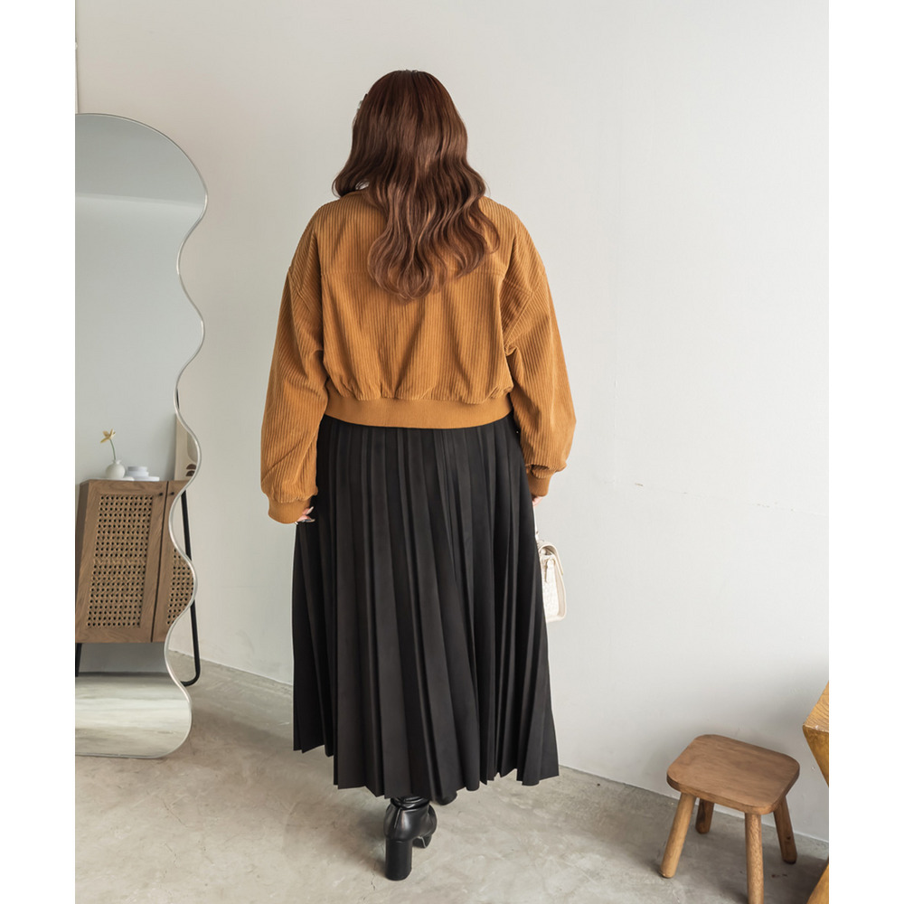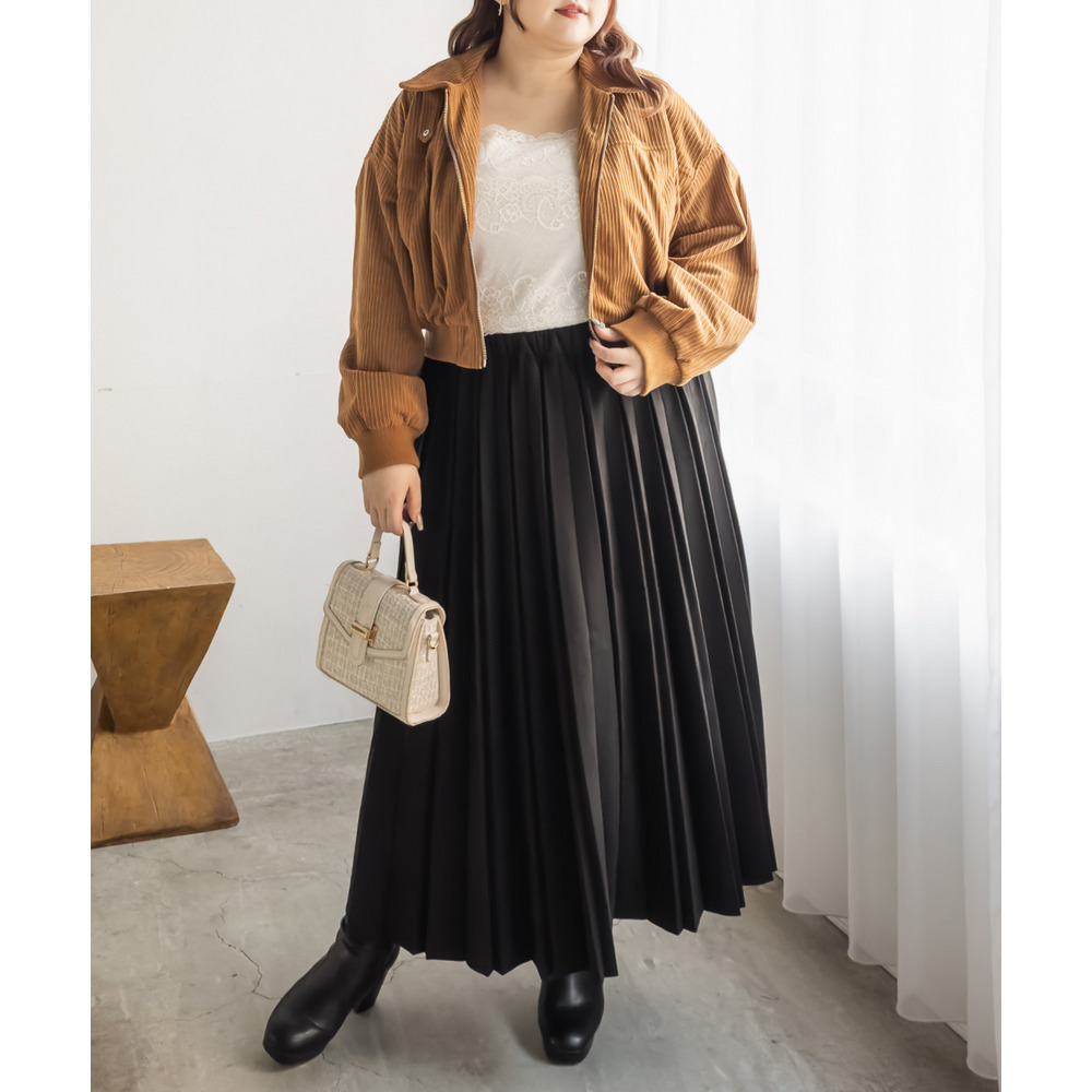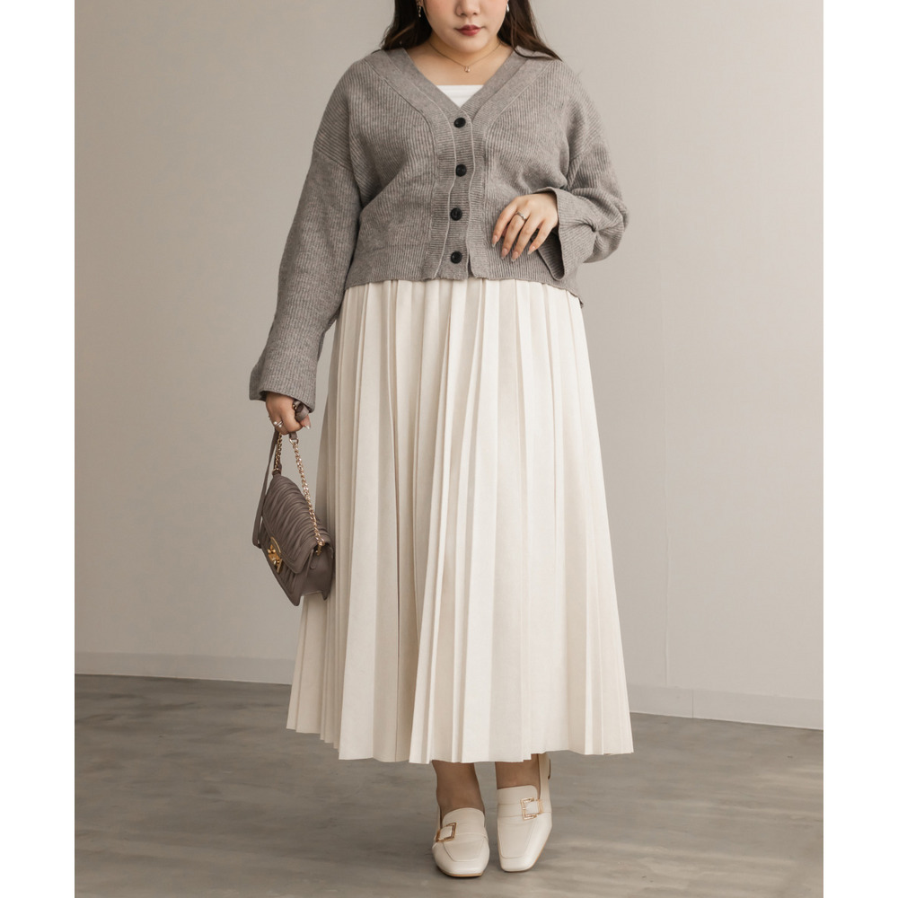 3Lサイズを着用しました。着用感はちょうどいいです。しっとりとしたフェイクスエード素材が上品で、秋冬らしい温かみをプラスしてくれる一枚です。プリーツデザインが縦ラインを強調し、すっきり見えするのも嬉しいポイント◎ ウエストはゴム仕様でラクなはき心地ながらも、広がりすぎないシルエットで大人っぽく着こなせます。ニットやブラウスを合わせてフェミニンに、スウェットを合わせてカジュアルダウンしてもおしゃれに決まります。
