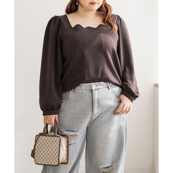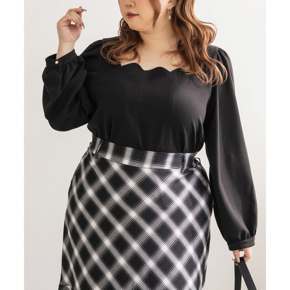 3Lサイズを着用しましたが程よくよくゆとりもあり、生地もやわらかくリラックスして着られました。構築的な切替が入っていて、自然に体型をカバーしてくれて、メリハリのある印象です!上品見えする生地・デザインでシンプルなのに特別感のある1枚です!首元はスカラップになっていてさりげなく華やかなのもポイントです。オフィスカジュアルなどにもピッタリで、普段使いはデニムパンツ合わせでカジュアルに、スカート合わせでフェミニンにも着回せる万能トップスです◎