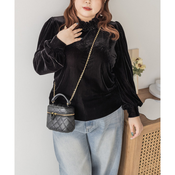 | 3Lサイズを着用してちょうどいい着心地でした。伸縮性のある生地で、ネックや袖口もゴムになっていて、ラクチンなだけじゃなく見た目も可愛いです◎リブの縦ラインがあるので華奢見えも叶います!秋冬らしい雰囲気になれるベロア生地だけど、薄手なので、ごわつかず重ね着もしやすいです!ジャケットのインナーにしてもワンピのインナーにしても可愛いプチハイネックで、たくさん着回しの効く1枚です! |