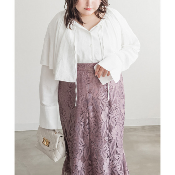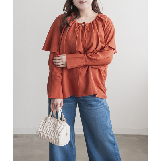 | 3Lサイズを着用してちょうどいいサイズ感でした。ボタンは開く仕様なのと首元はリボンのデザインになっているので、窮屈感もなく着用出来ました◎顔回りのフリルがかわいいだけじゃなく、丸みをカバーしてくれました!ふんわり軽い生地もポイントで女性らしくやわらかい印象になりました。着丈も短すぎないので、タックインしてもしなくても着こなせるのがうれしいです!お仕事から普段使いまでたくさん着回しできそうです! |