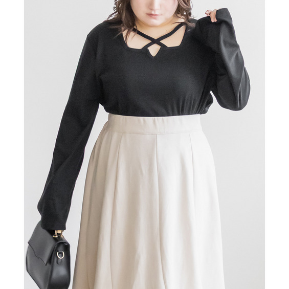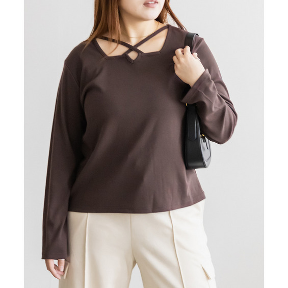 3Lサイズを着て丁度いいサイズ感でした!柔らかなリブのカットソーでストレスのない着心地です◎顔回りを女性らしい雰囲気にしてくれるネックラインで、クロスになっているからメリハリが出て引き締まって見えるのも嬉しいです♪可愛い系のボトムにも、カジュアルなボトムにも合わせやすいから色々なスタイルを楽しめます!