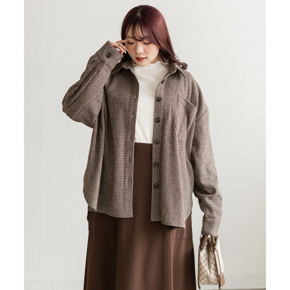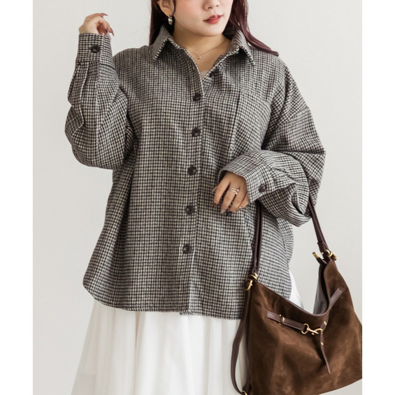 | 3Lサイズを着用しました。ぴったりのサイズ感でした。あたたかみのあるチェック柄と少し起毛がかった生地は秋冬にぴったりです!トップスとしても羽織としても着回しできるのも嬉しいポイントです◎長めの着丈で、腰回りもカバーしてくれます! |