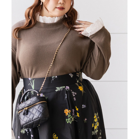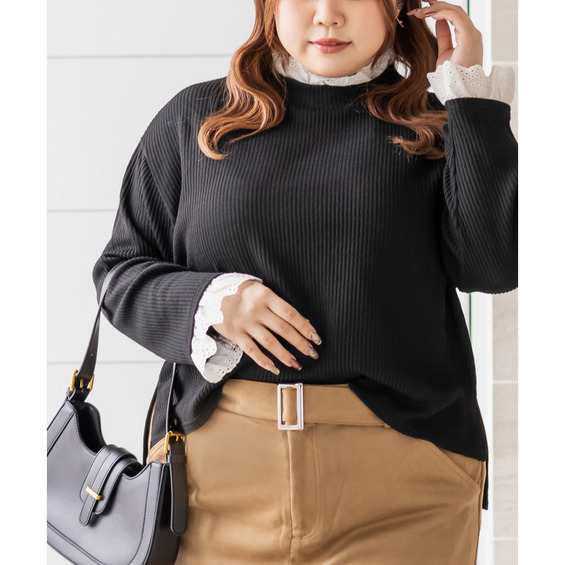 | 3Lサイズを着用してちょうどいい着心地でした。秋冬らしい雰囲気になれる生地だけど、薄手なので、ごわつかず重ね着もしやすいです!ネックや袖口からチラッと見えるレースが可愛くてトップスとしても重ね着してもお洒落な印象です♪リブの縦ラインがあるので華奢見えも叶います!ジャケットのインナーにしてもワンピのインナーにしても可愛いプチハイネックで、たくさん着回しの効く1枚です! |