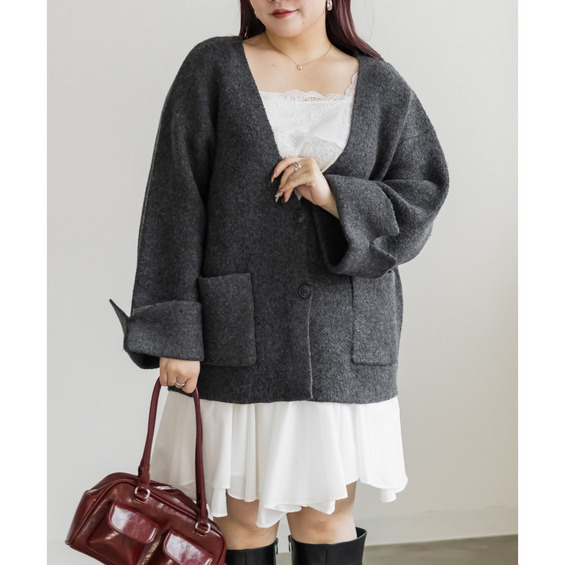 3Lを着て丁度いいサイズでした。ゆったりしたシルエットなので余裕のある着心地で着ることが出来ました。羽織るだけでコーディネートが決まるニットカーディガンです◎厚手のニットなのでアウターのような感覚に近い着こなしがお勧めです♪ボタンを開けても閉めても可愛く着こなせて、深いVネックがすっきりした印象で小顔効果をプラスしてくれます!