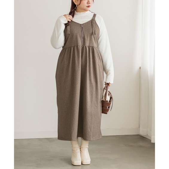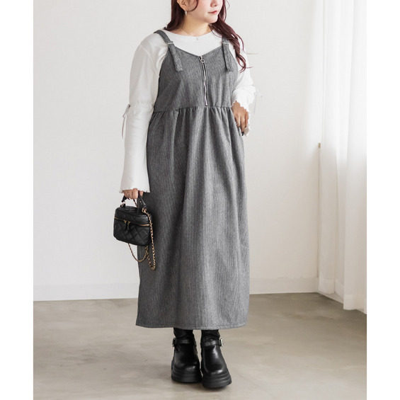 | 3Lサイズを着用して、バストやウエスト周りもちょうどよく、ラインを拾わず楽な着心地でした◎フロントのジップがアクセントになっていて、甘さの中にもモード感をプラスしてくれます♪スカート部分は程よくフレアに広がって、気になるヒップや太ももをしっかりカバー。デザイン性がありながらも1枚でさらっと着られるワンピースなので、コーデに迷わない優秀アイテムです!季節感のある起毛素材と千鳥柄がかわいい!スニーカーを合わせてカジュアルに着崩すのもおすすめです!インナー次第で雰囲気や季節感も変えて楽しめるワンピースです。 |