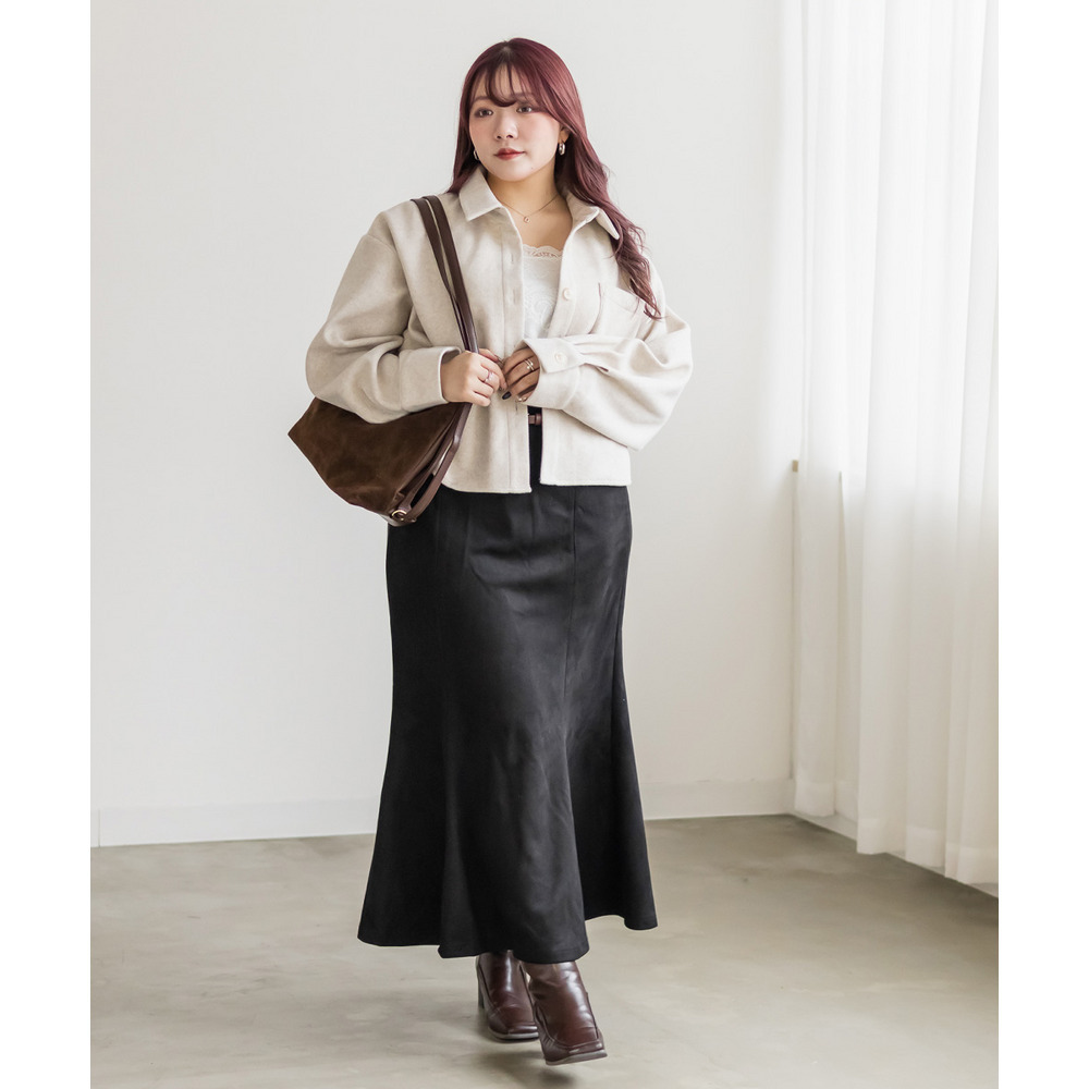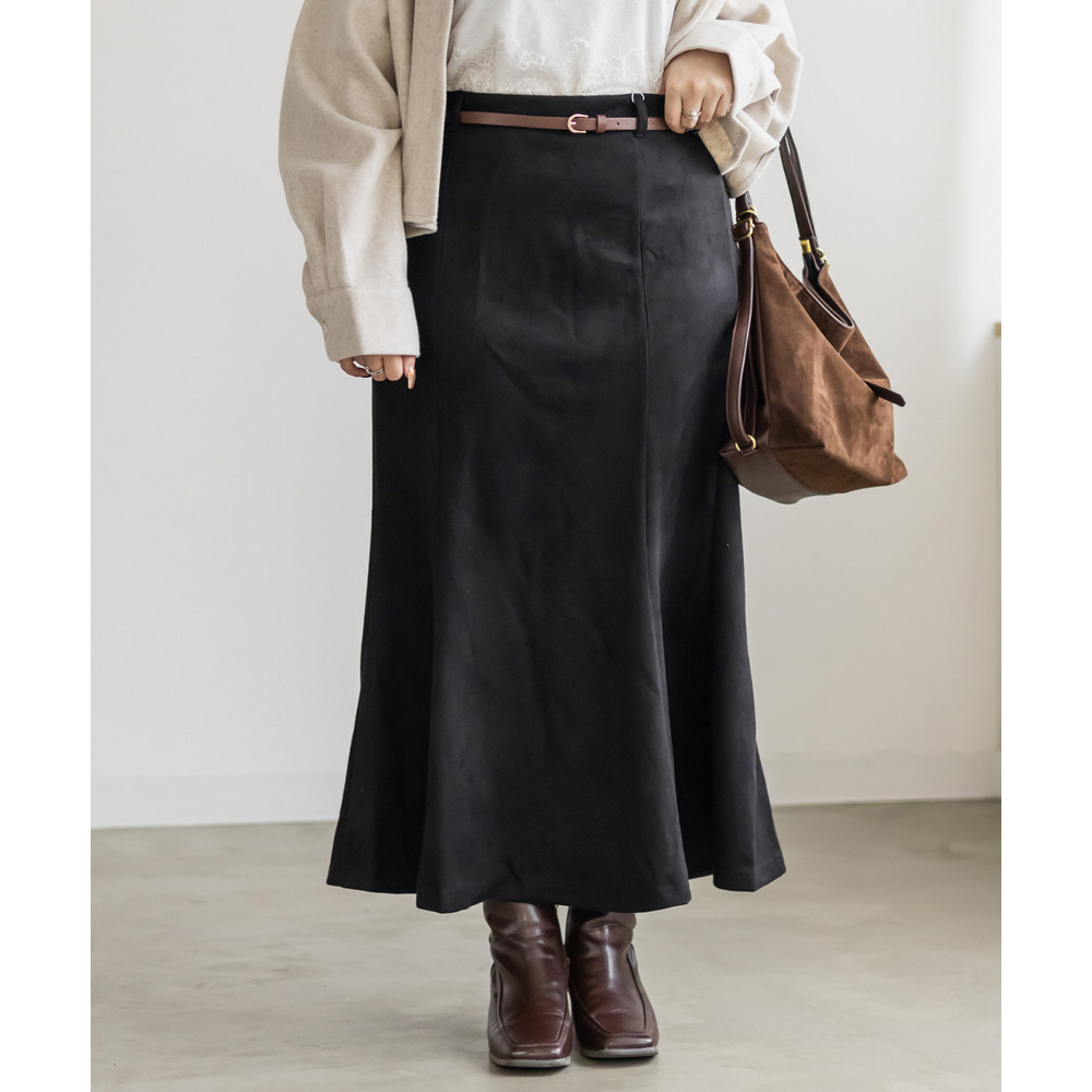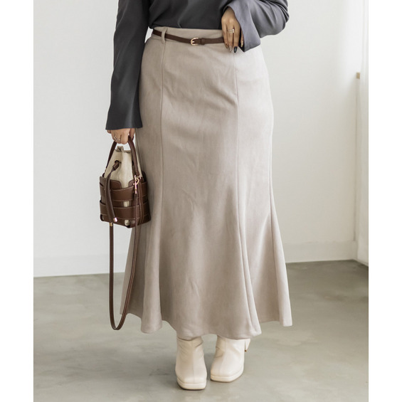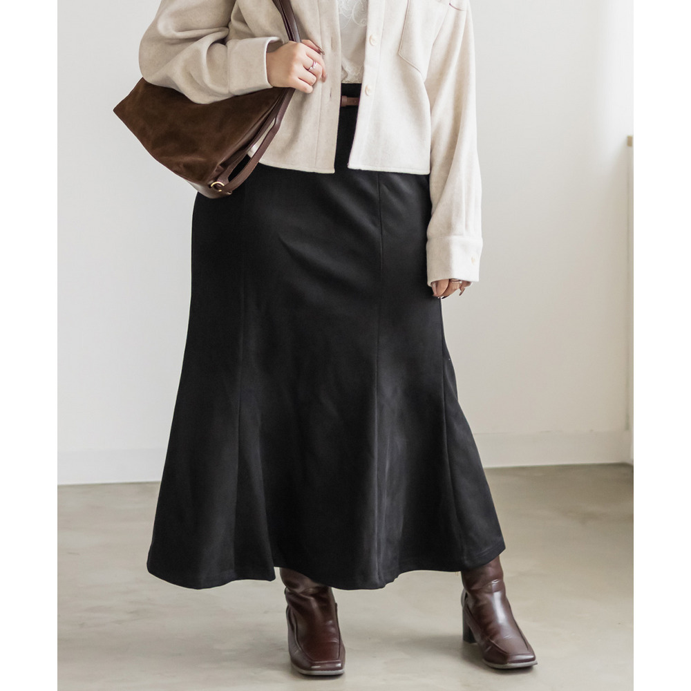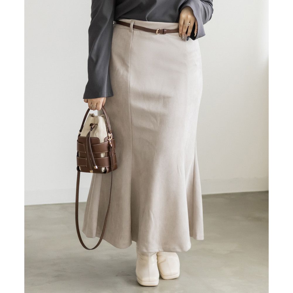 3Lサイズを着用して、ジャストサイズでした。フィット感のあるマーメイドシルエットなので、腰回りなど気になる方はヒップ等のサイズ確認をお勧めします◎後ろゴム仕様なのと、ベルトがついているので幅広いサイズ感の方に着用していただけます。裾に向かって流れるマーメイドシルエットなので下半身を華奢にみせてくれます。長めのスカート丈も脚長に見え、ブーツなどを合わせて季節感のある着こなしがおすすめです!オールシーズン着用でき、ベルト付きなのも嬉しいポイントです♪