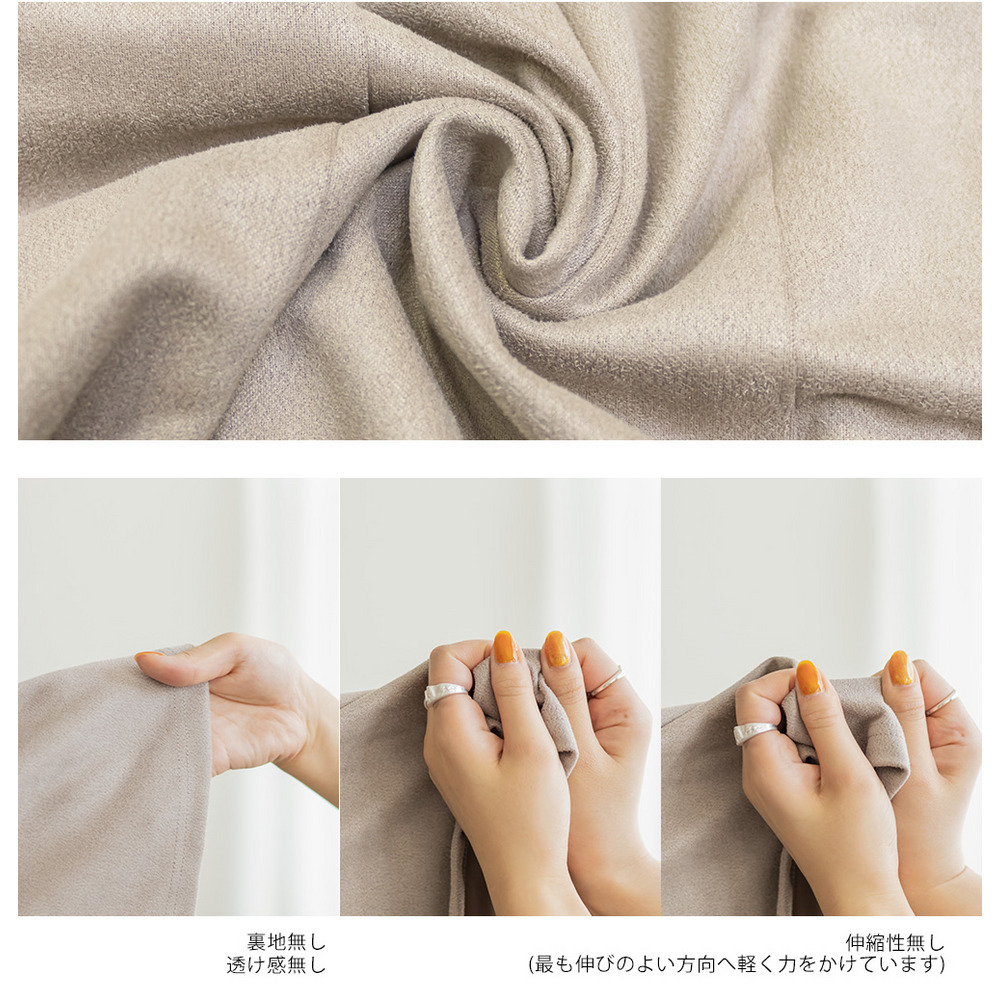 素材 ■素材 ポリエステル100% ■裏地・透け感・伸縮性 裏地無し、透け感無し、伸縮性無し ■ポケット 無し ■生地感 肌触りの良い柔らかな素材です。